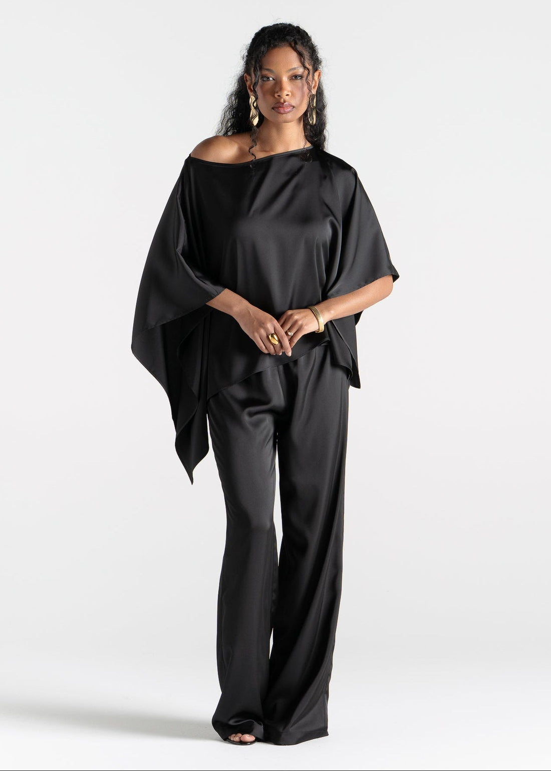 Fluid satin cape with asymmetric drape Wear it as you please: boat neck or one-shoulder...