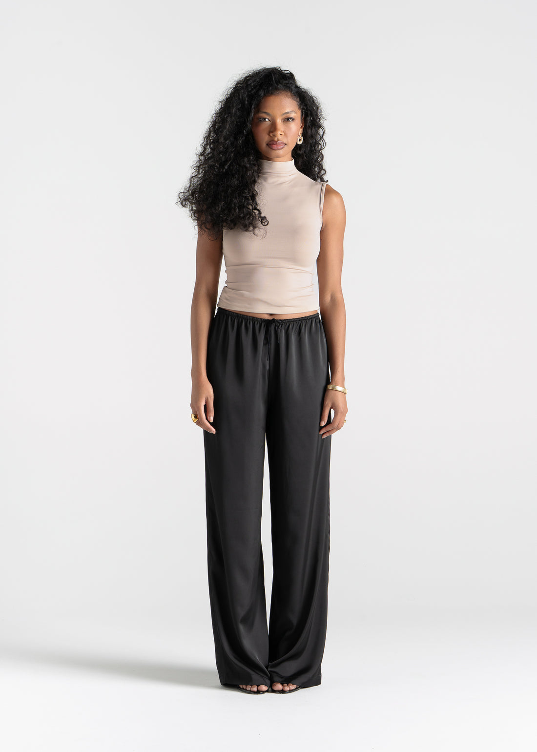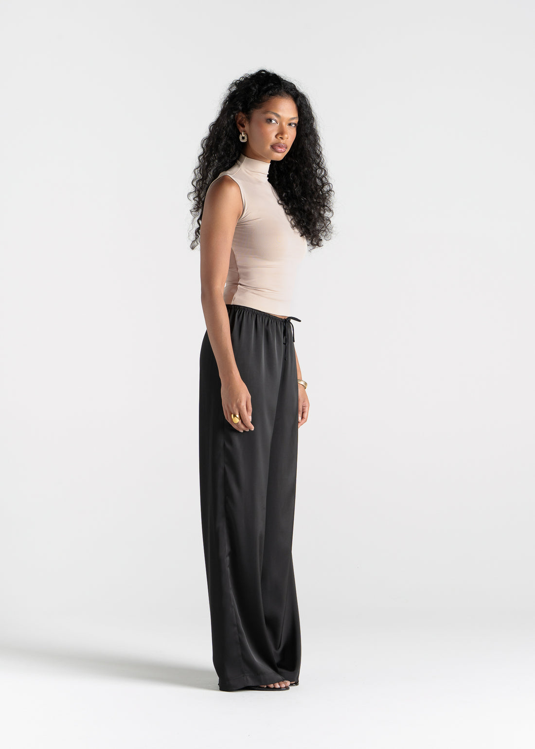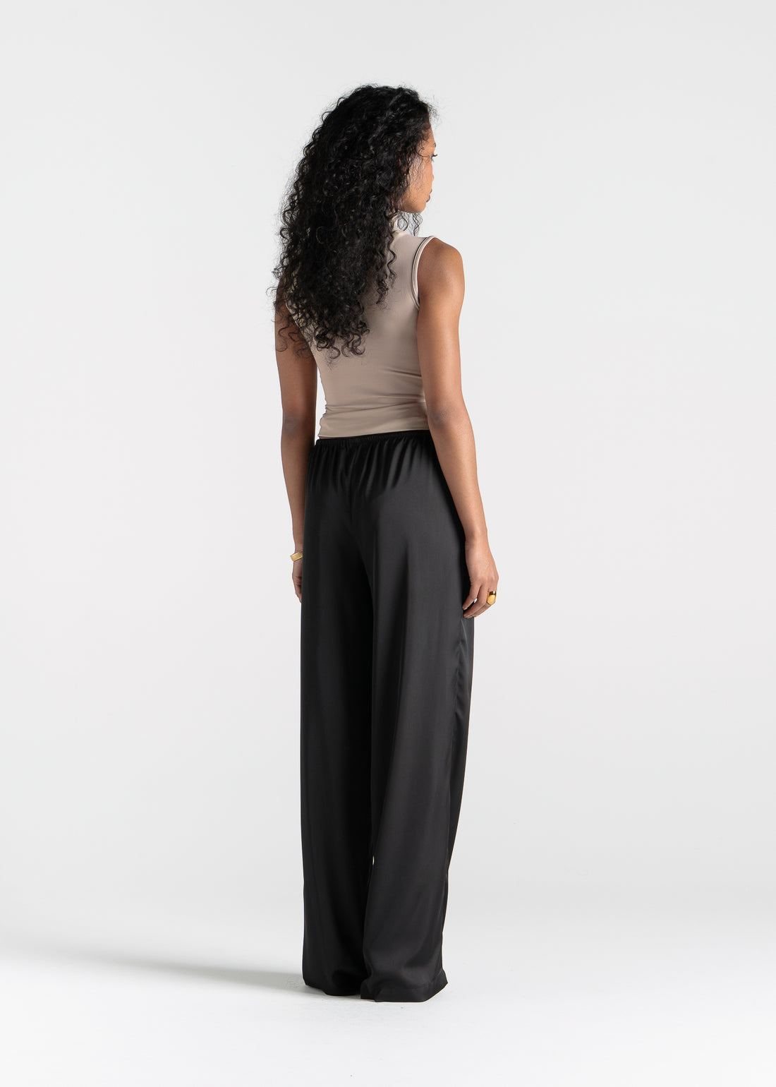 Adjustable drawstring Relaxed full-length leg Fluid satin trousers with a soft sheen and adjustable drawstring...