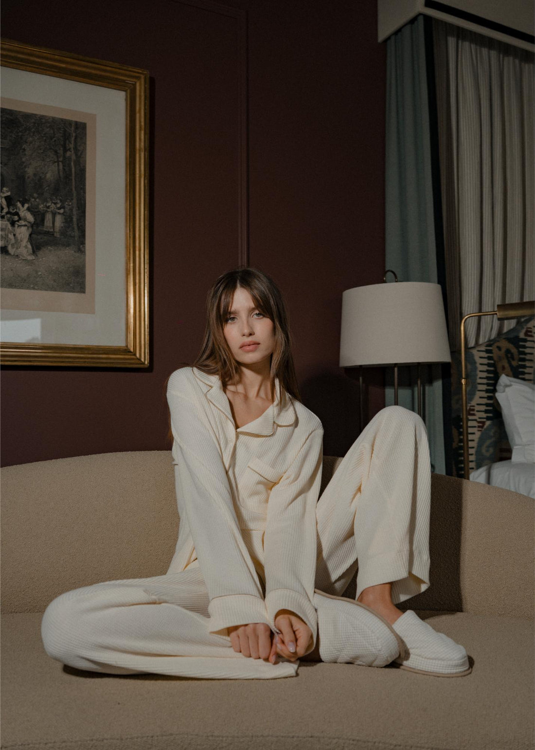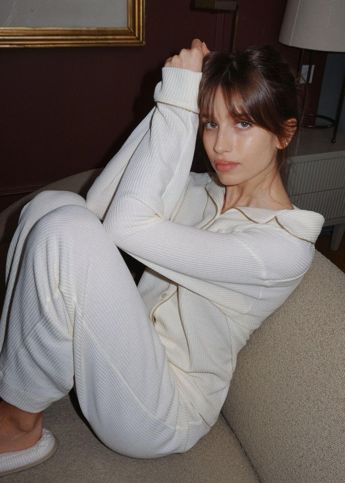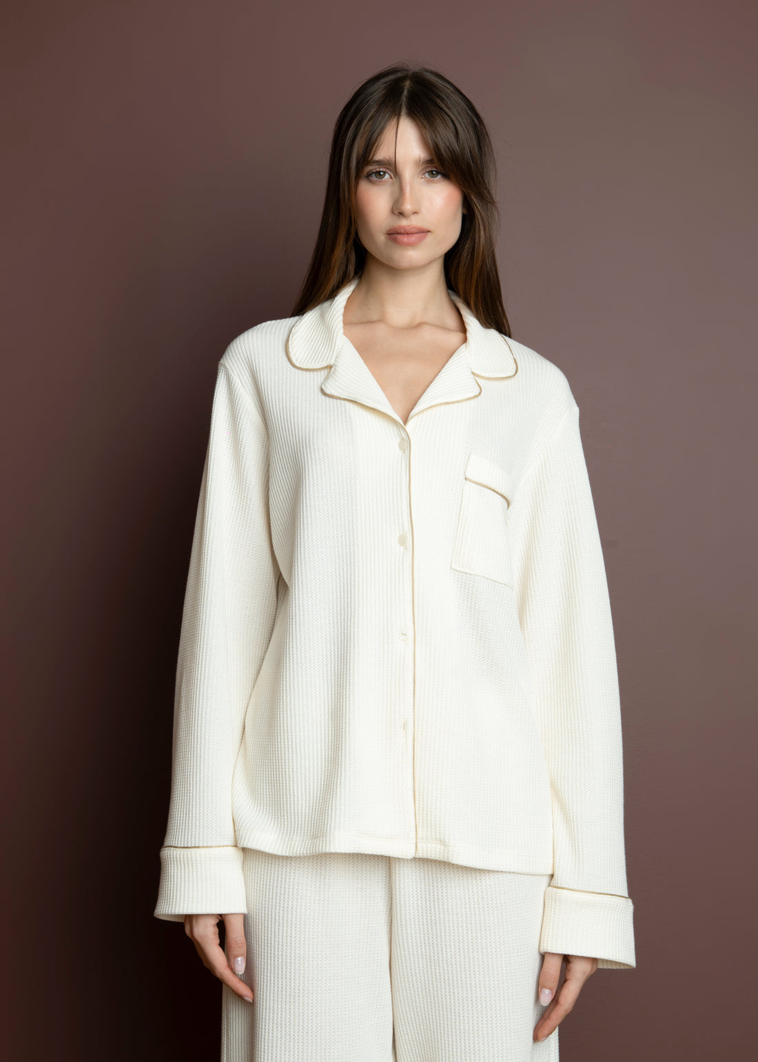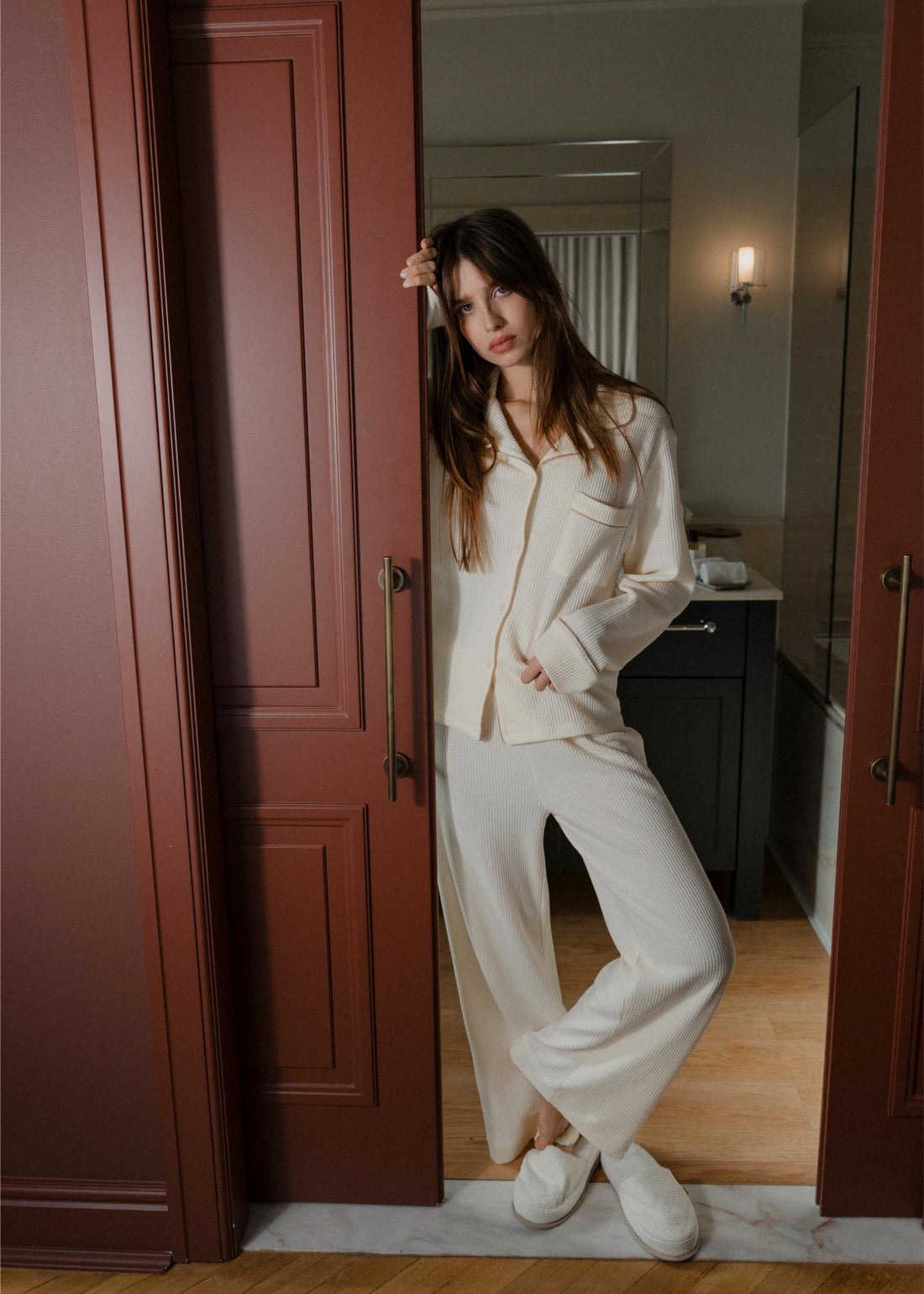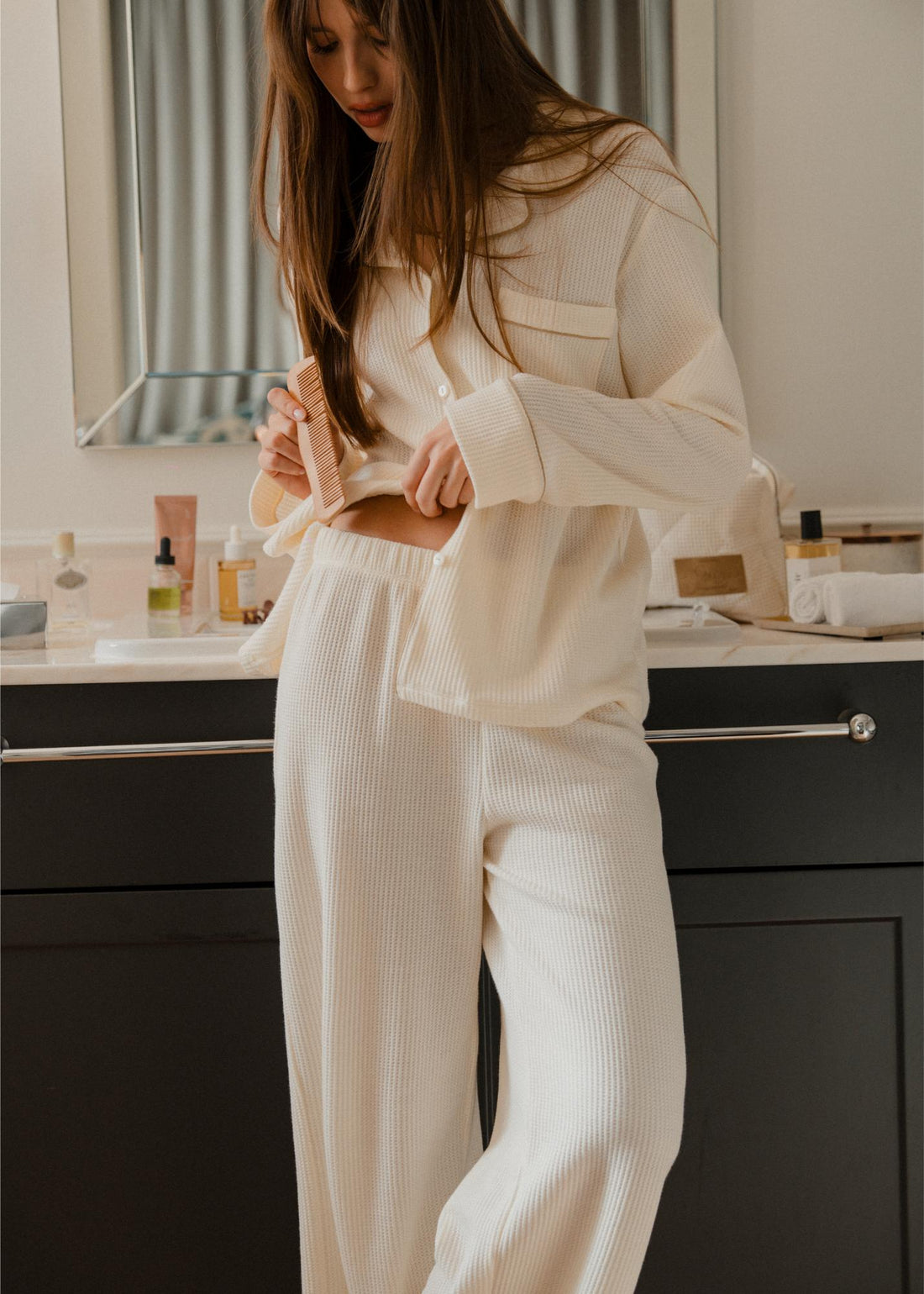 Extra soft and comfy textured knit mesh Relaxed shirt with matching wide-leg pants Pants feature...