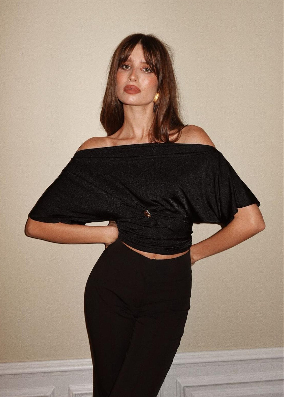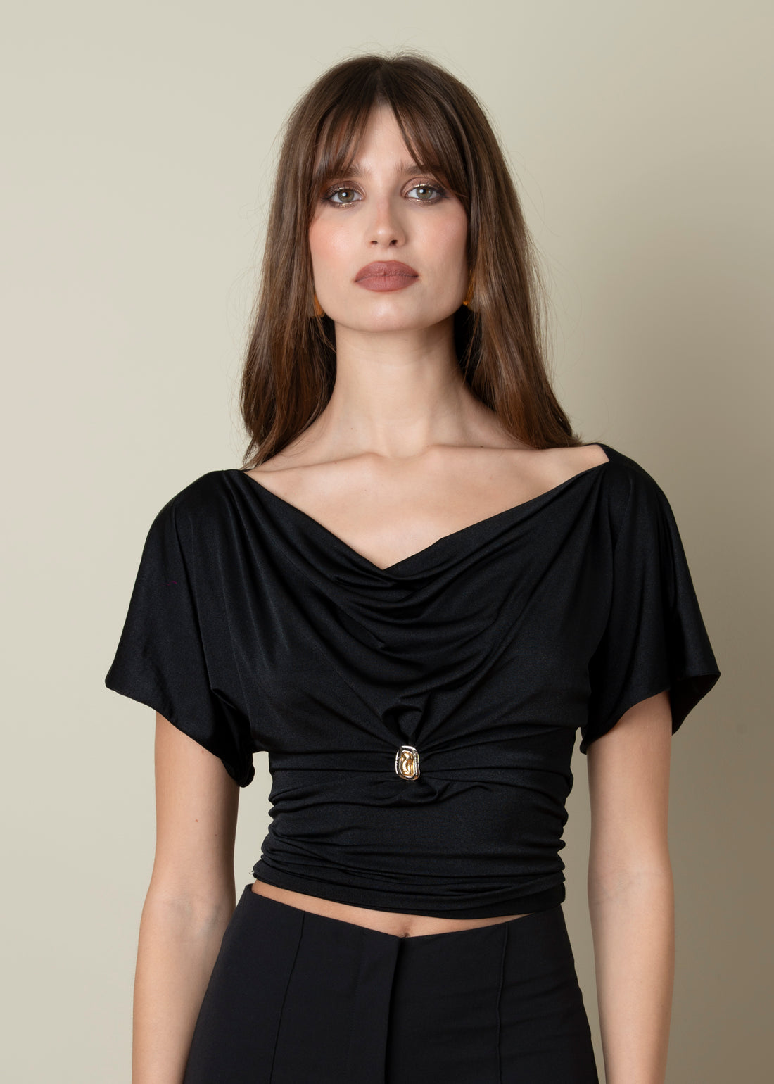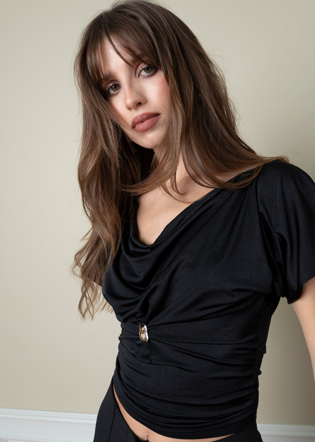 Draped cowl neckline Short flutter sleeves Gathered waist with front metal detail Astra is crafted...