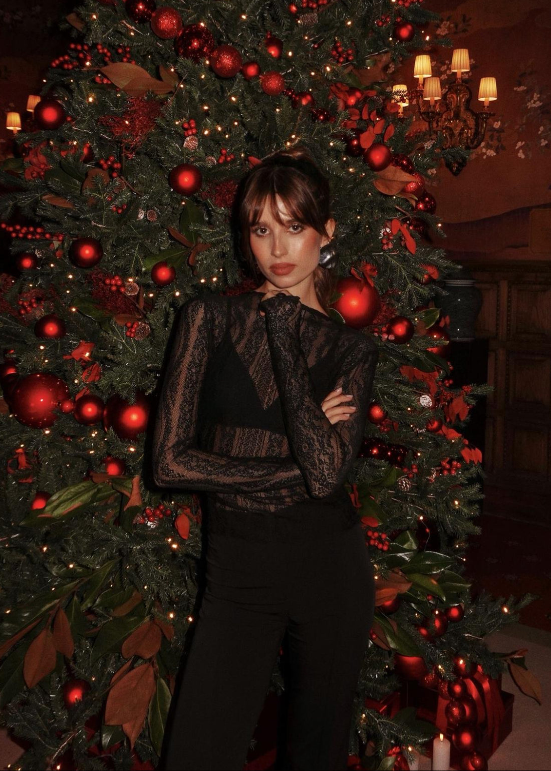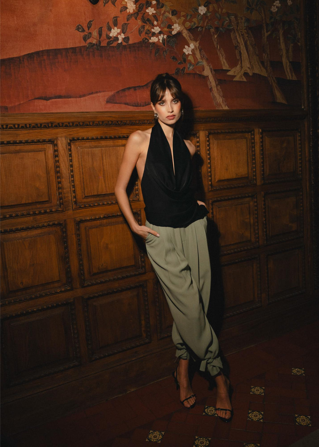 Shimmering sequin embellishment Deep V-neckline and cropped design Open-back silhouette with adjustable back ties Sequin...