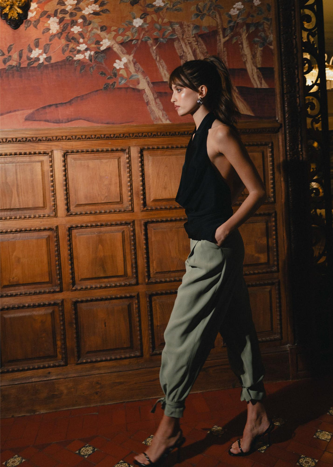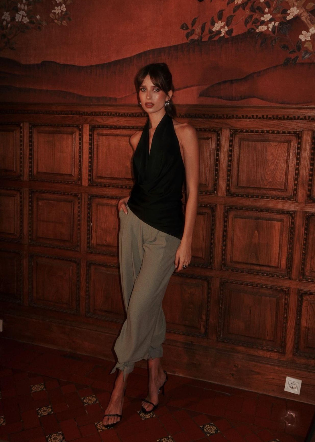 Lined on the inside Deep V halter neckline Adjustable open-back tie This halter top features...