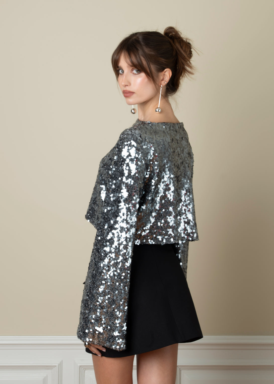 All-over sequins Cropped silhouette Wide flared long sleeves Lined for extra comfort Shimmering dark sage...