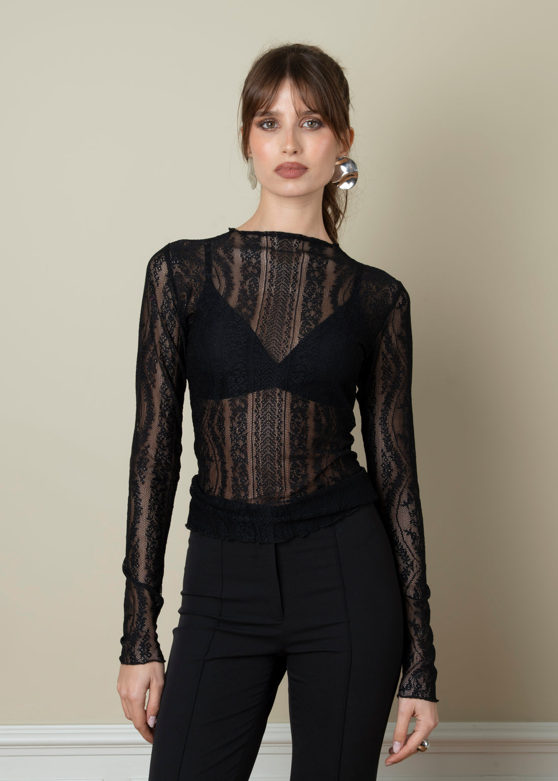 Sheer lace fabric Body-hugging fit Stretchy mesh Long-sleeve top is made from sheer lace with...