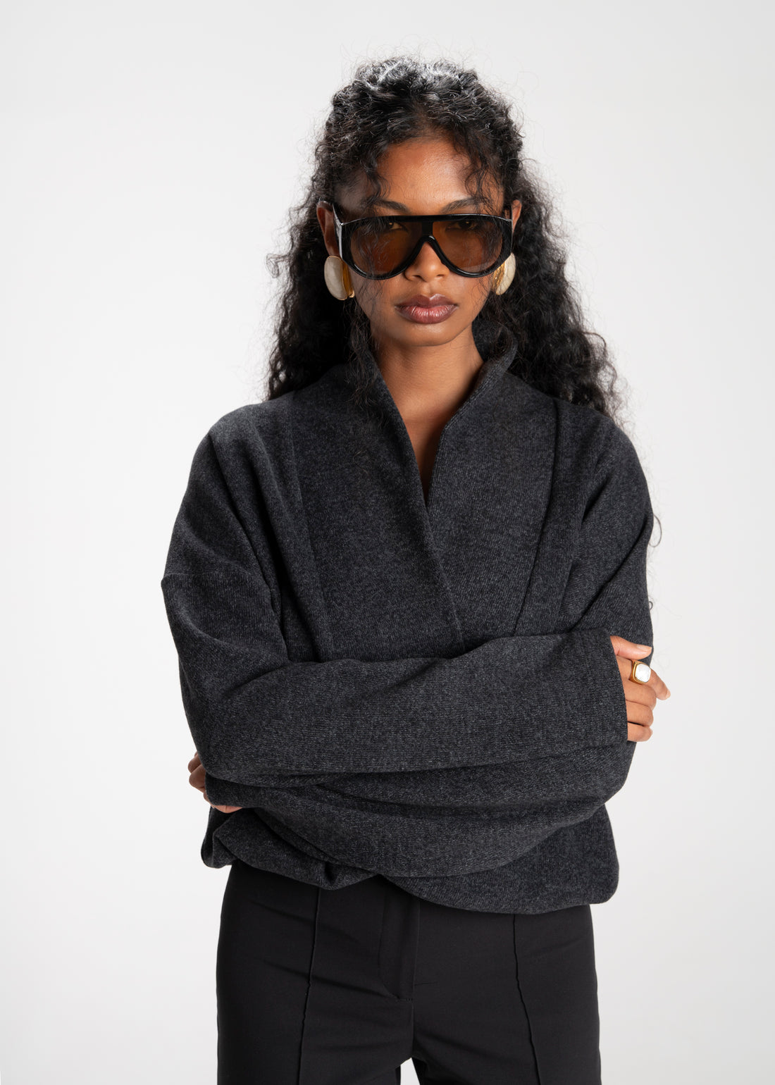 Metallic-stretchy mesh Asymmetric draped hem Open back cutout Long-sleeve top made from a metallic stretch...