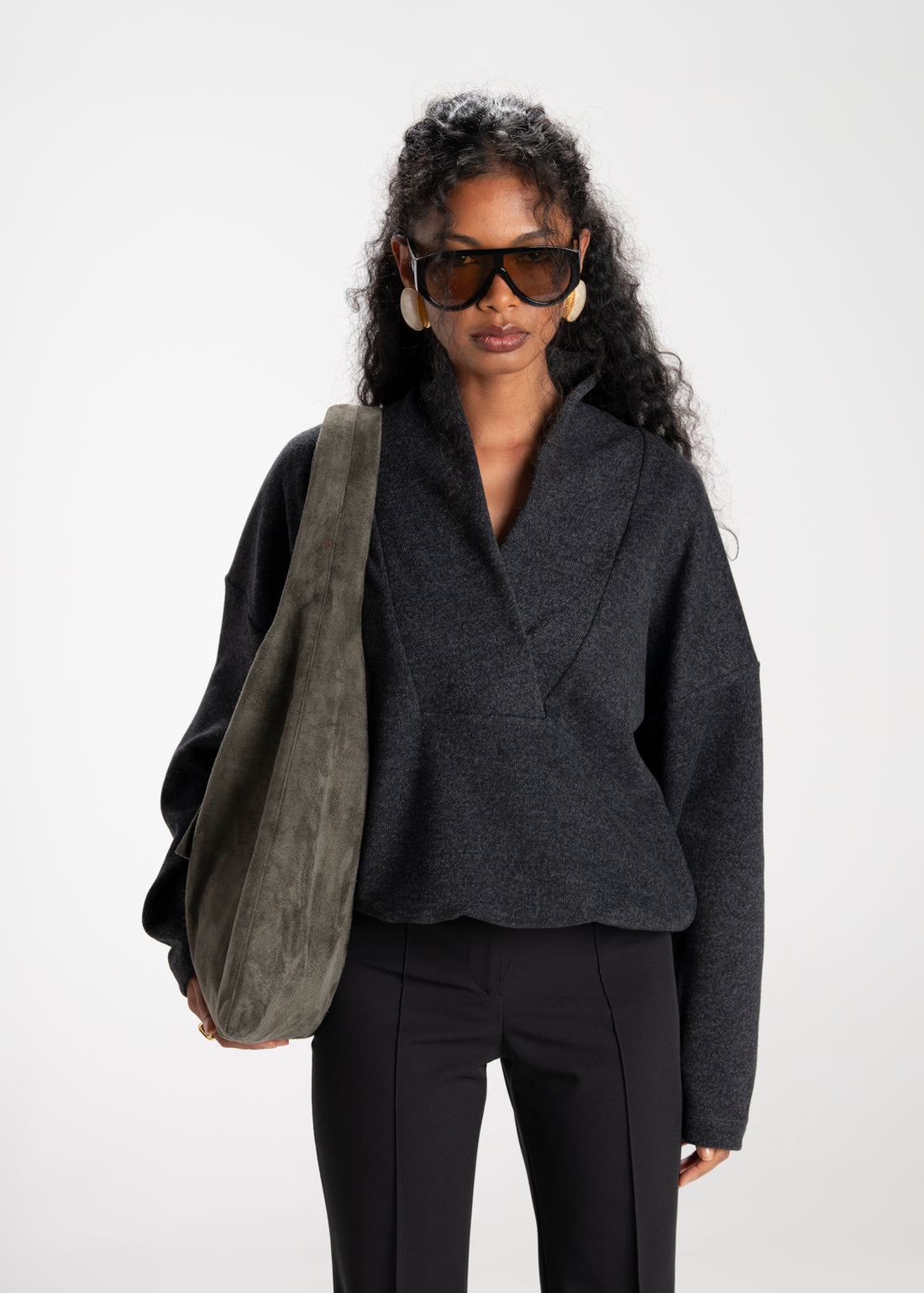 All-over sequins Cropped silhouette Wide flared long sleeves Lined for extra comfort Shimmering dark sage...