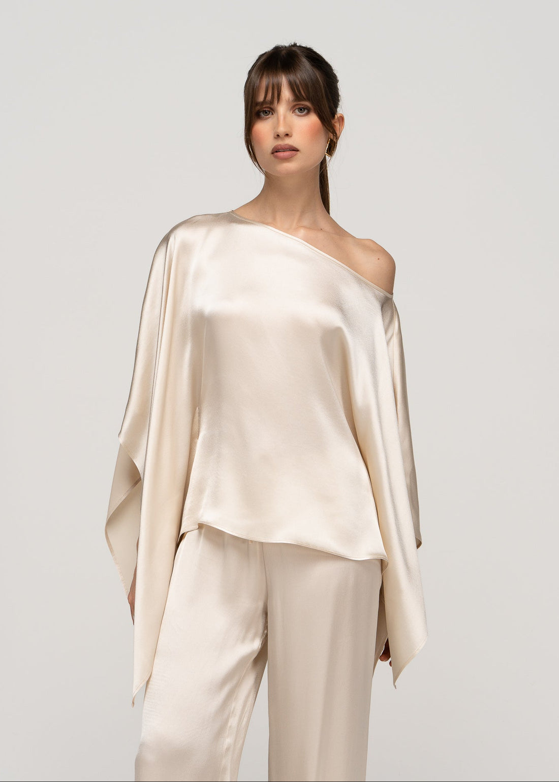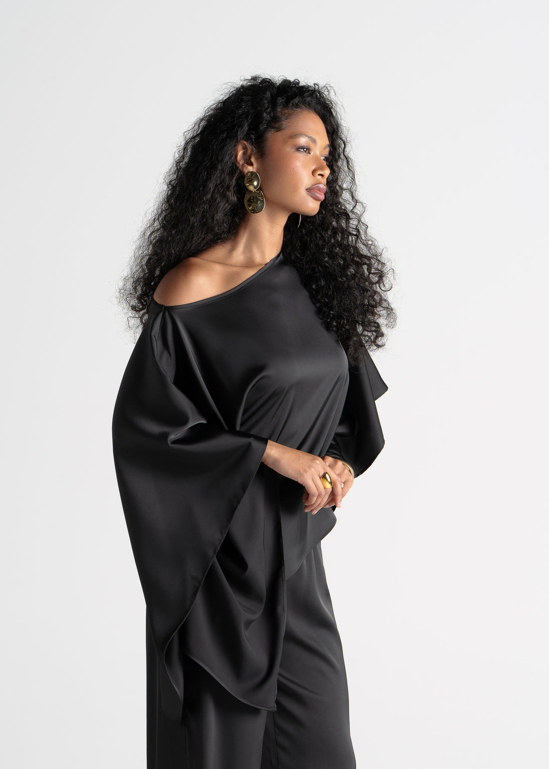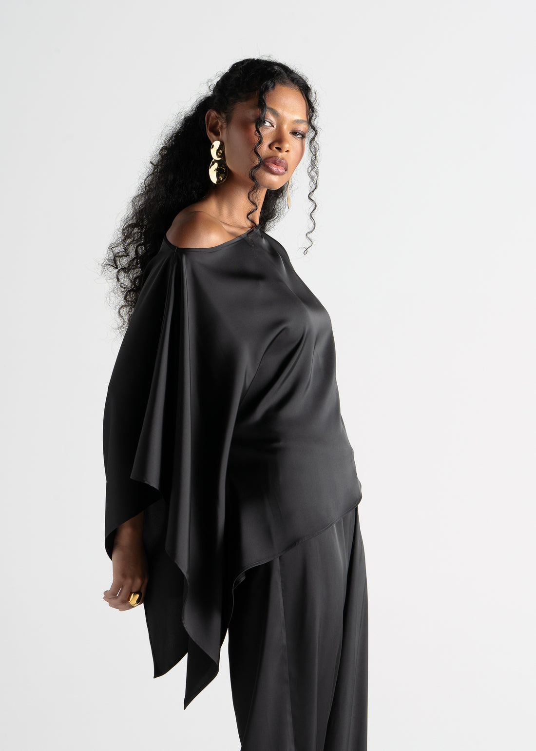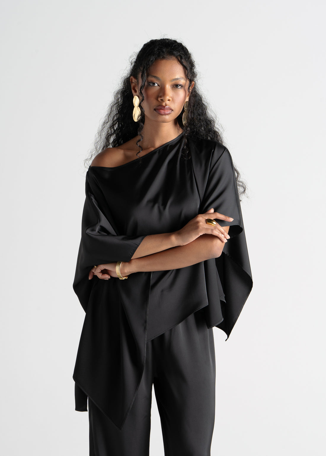Fluid satin cape with asymmetric drape Wear it as you please: boat neck or one-shoulder...