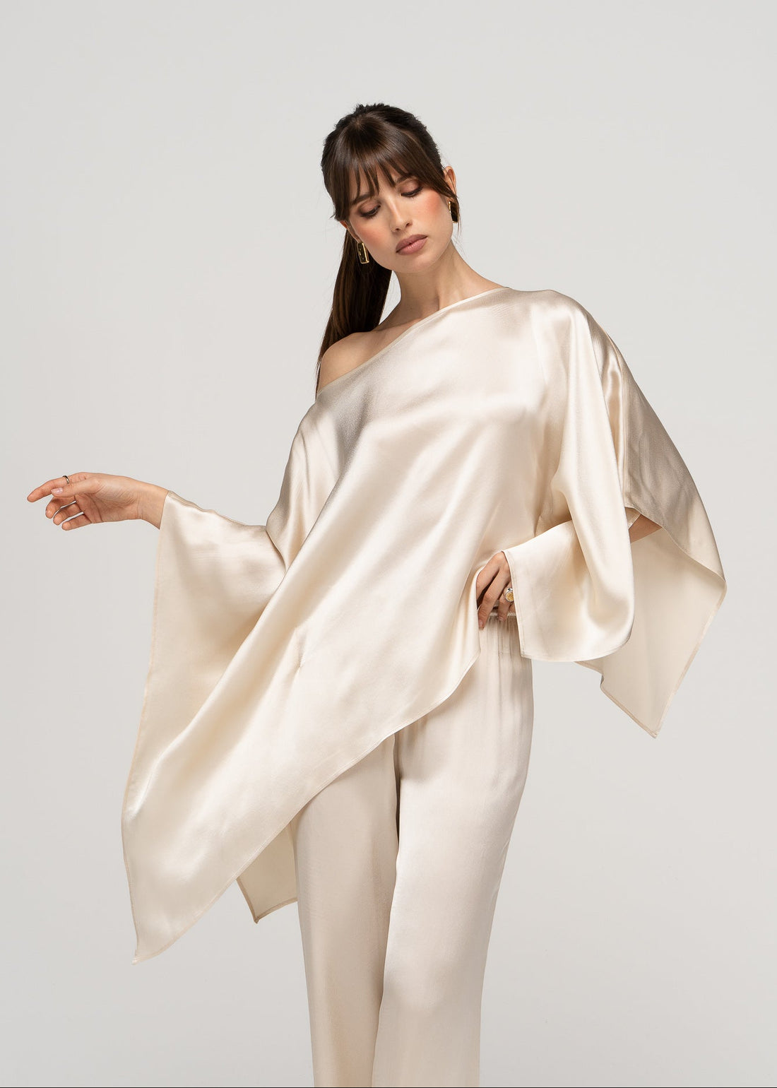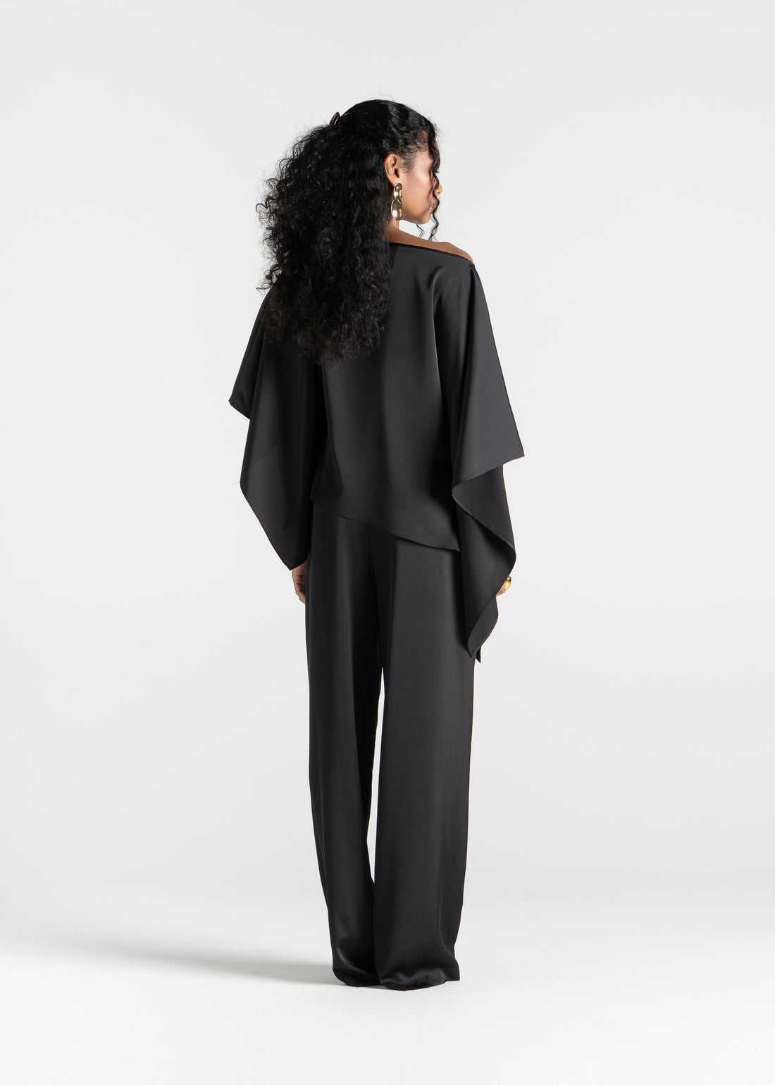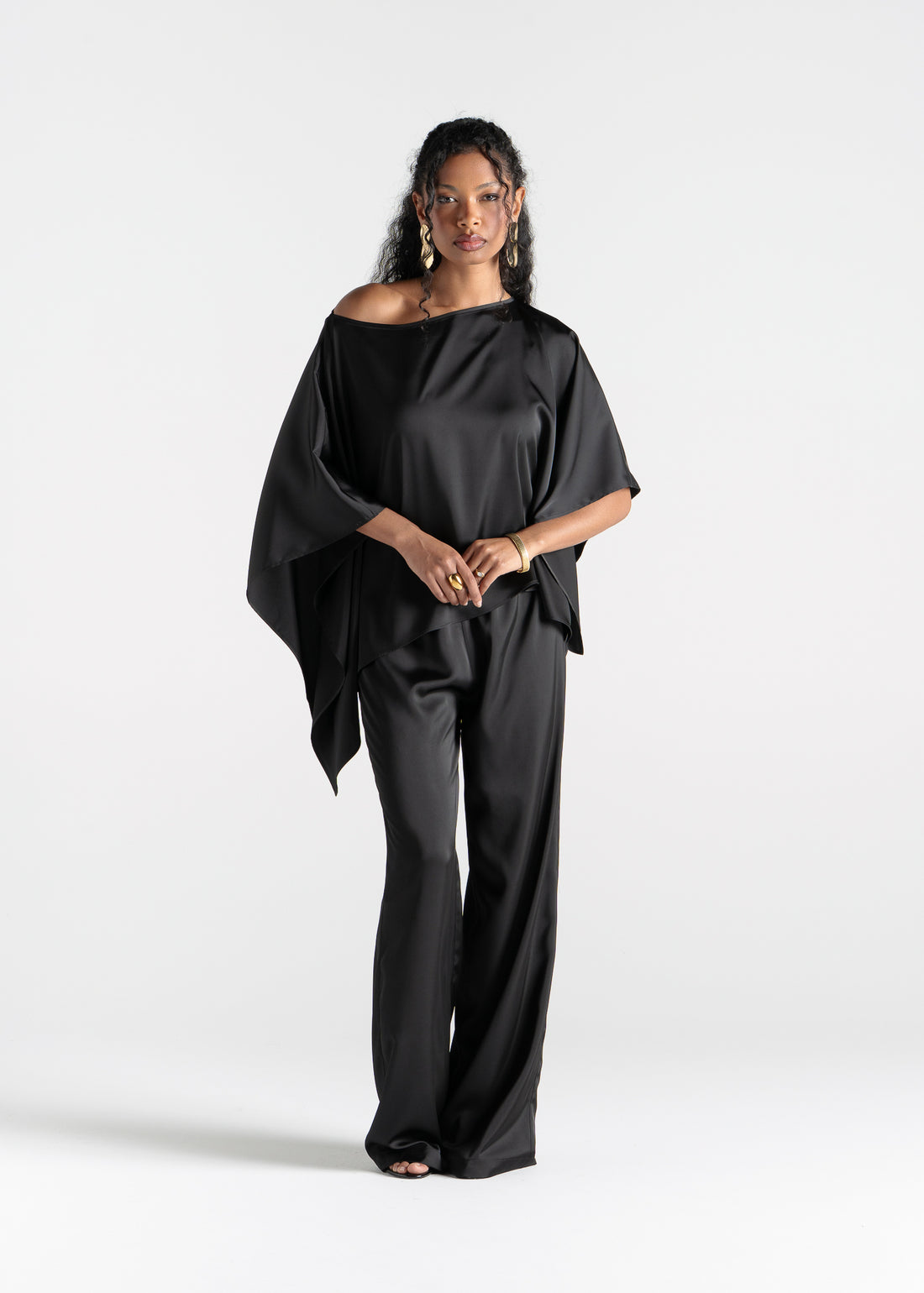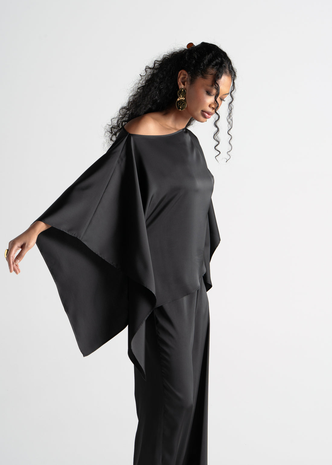 Fluid satin cape with asymmetric drape Wear it as you please: boat neck or one-shoulder...