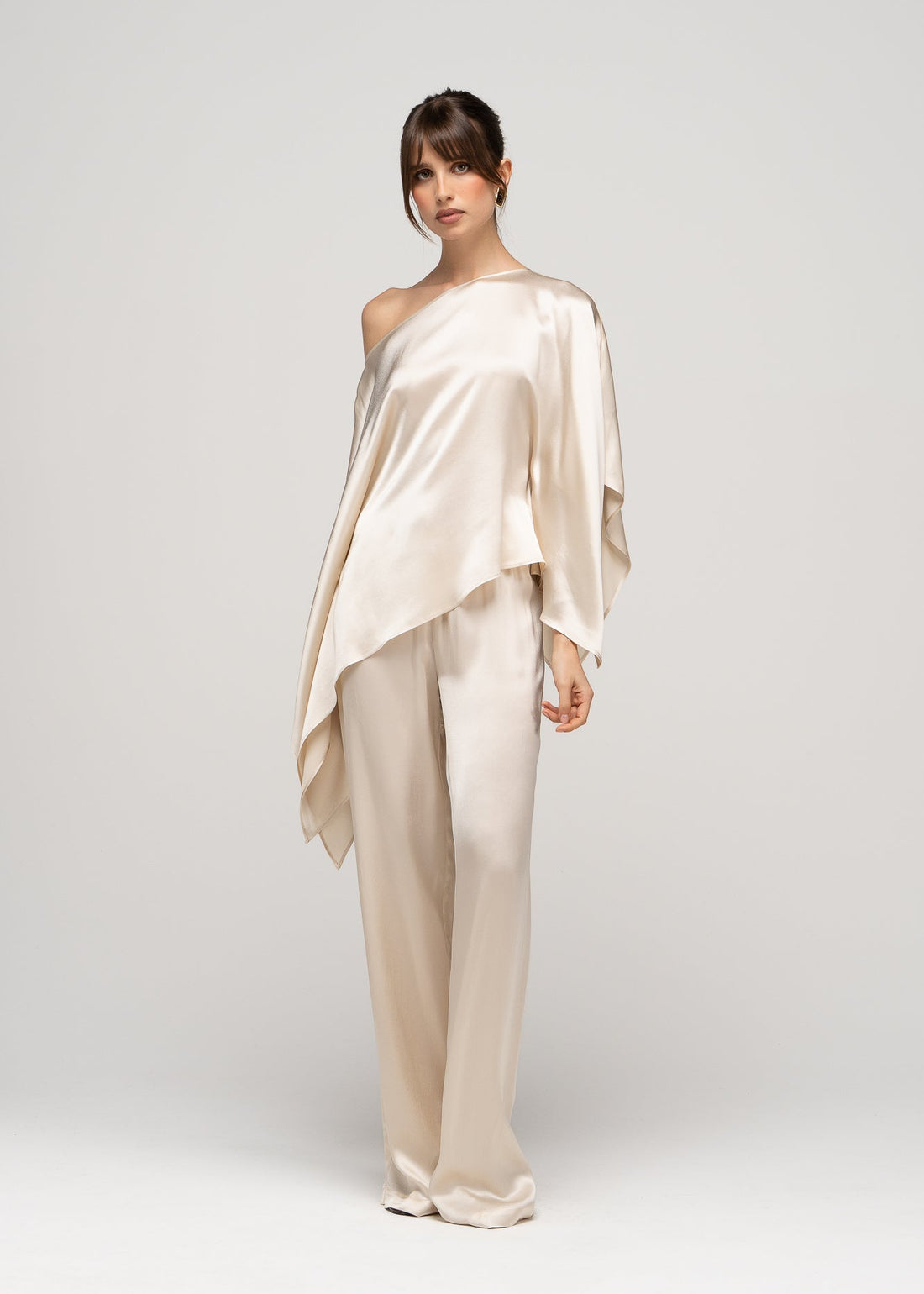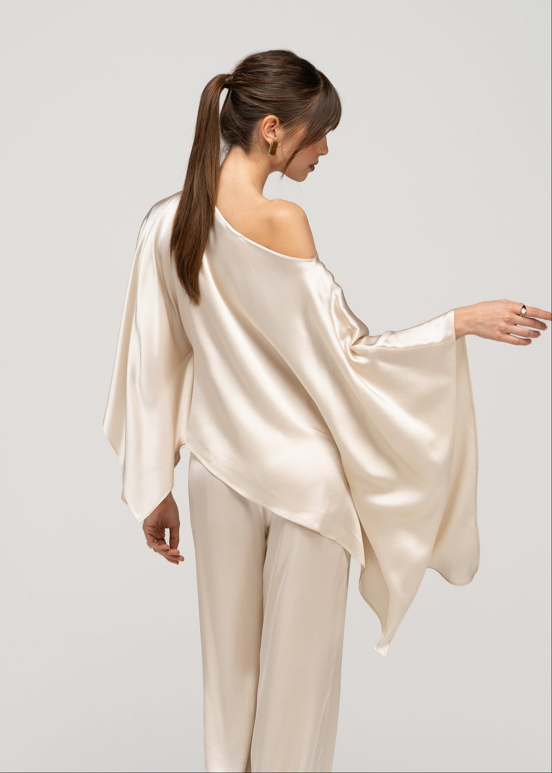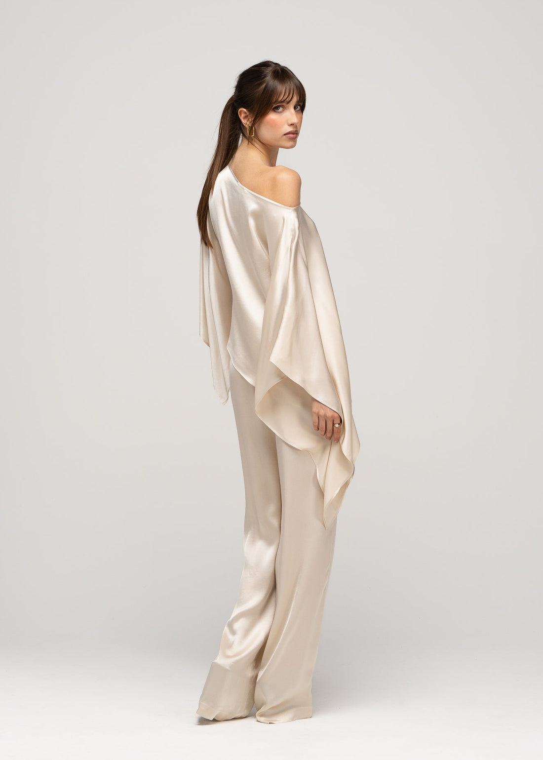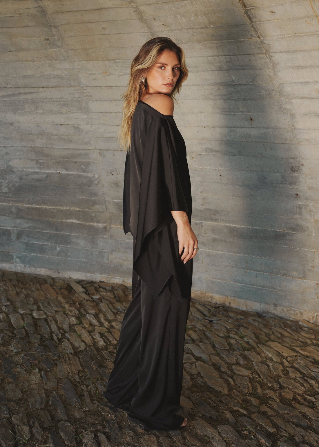 Fluid satin cape with asymmetric drape Wear it as you please: boat neck or one-shoulder...