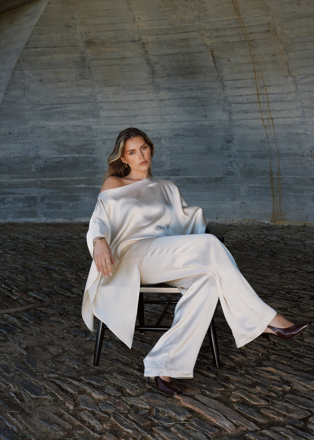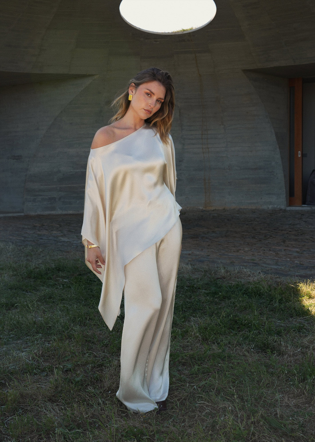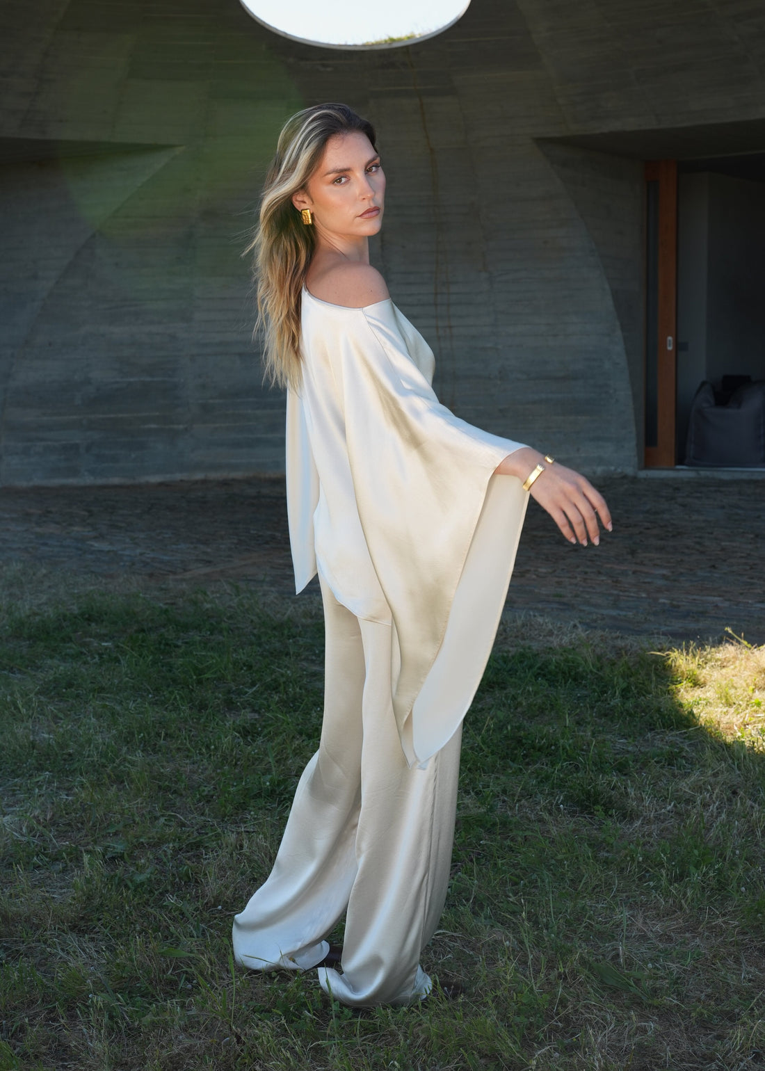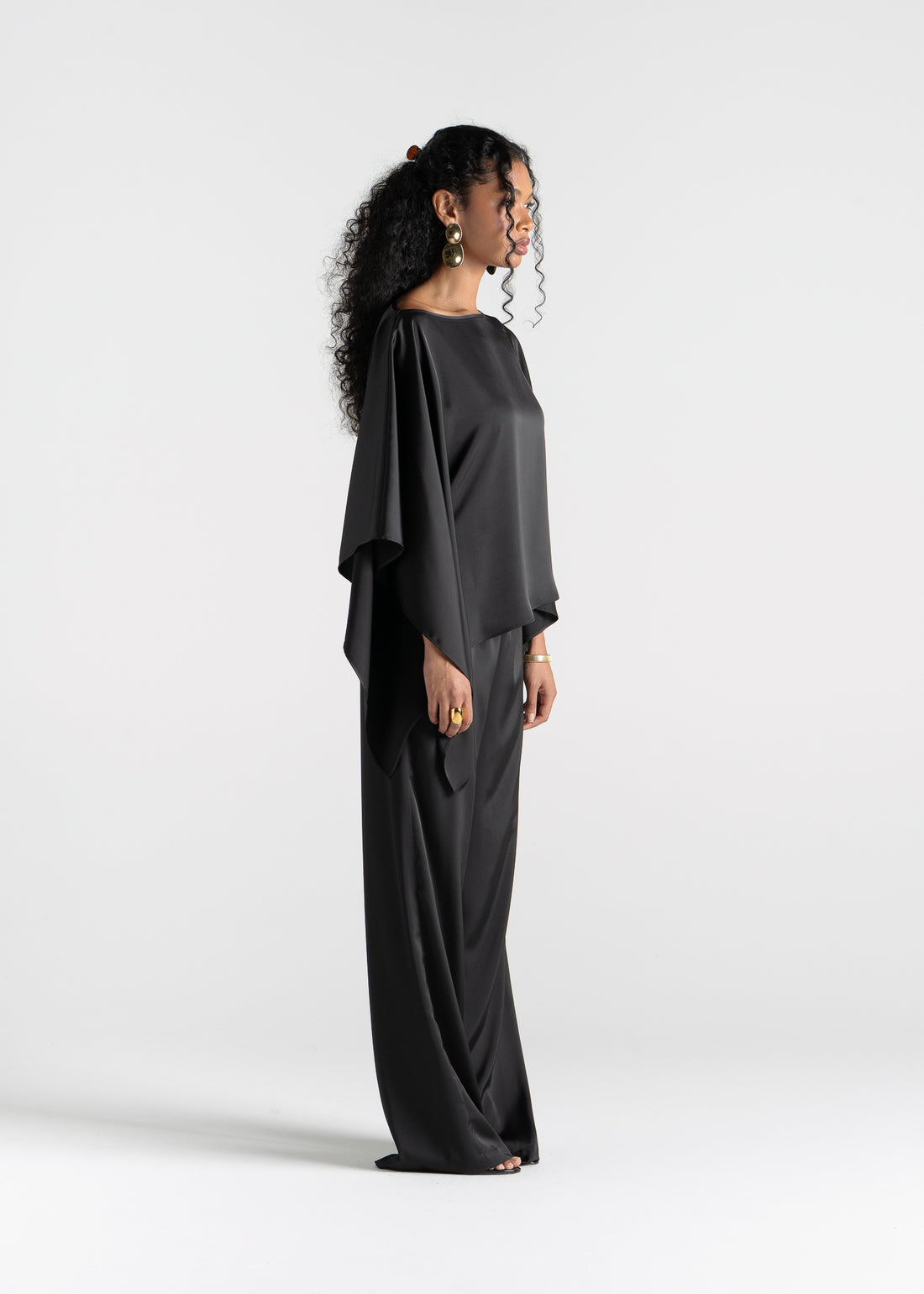 Fluid satin cape with asymmetric drape Wear it as you please: boat neck or one-shoulder...