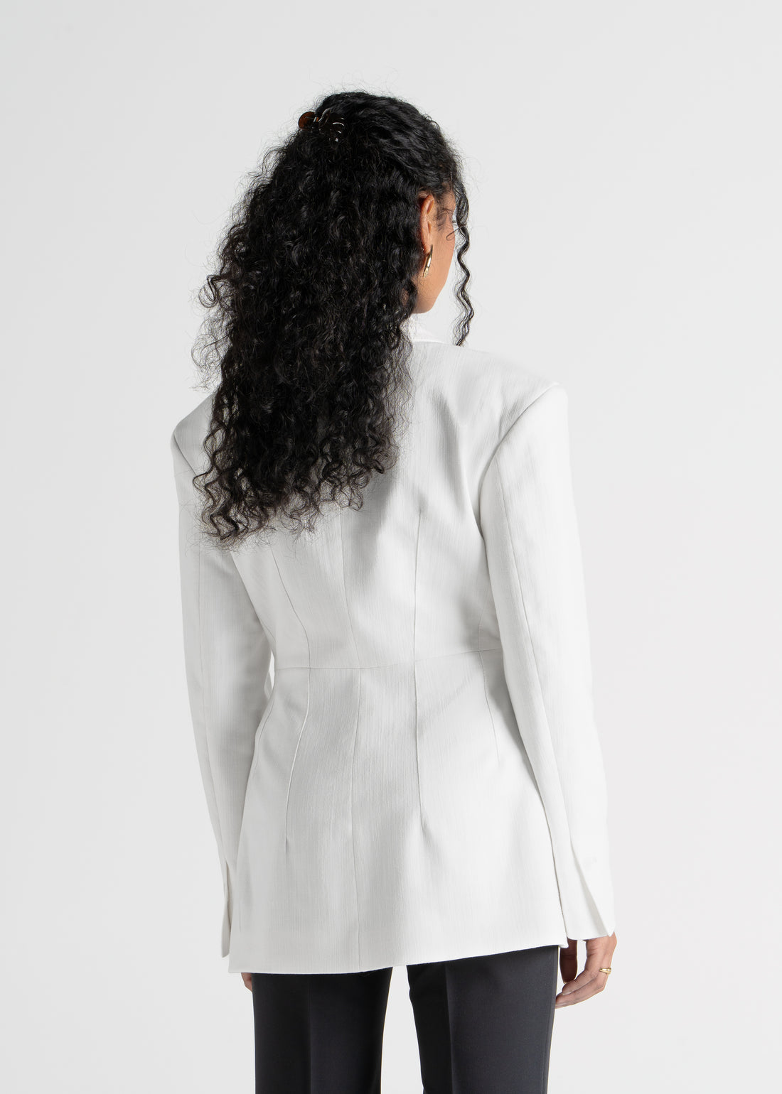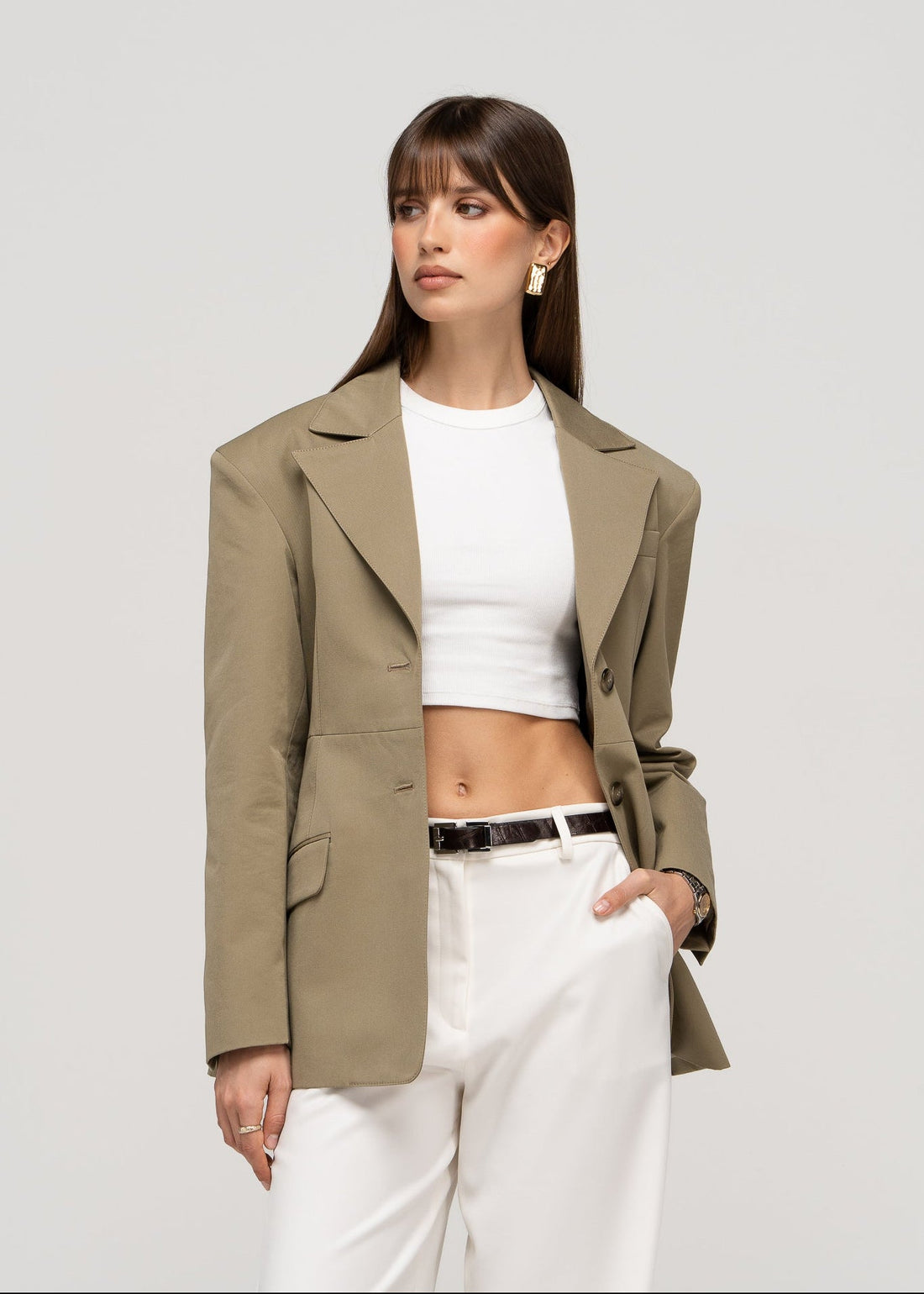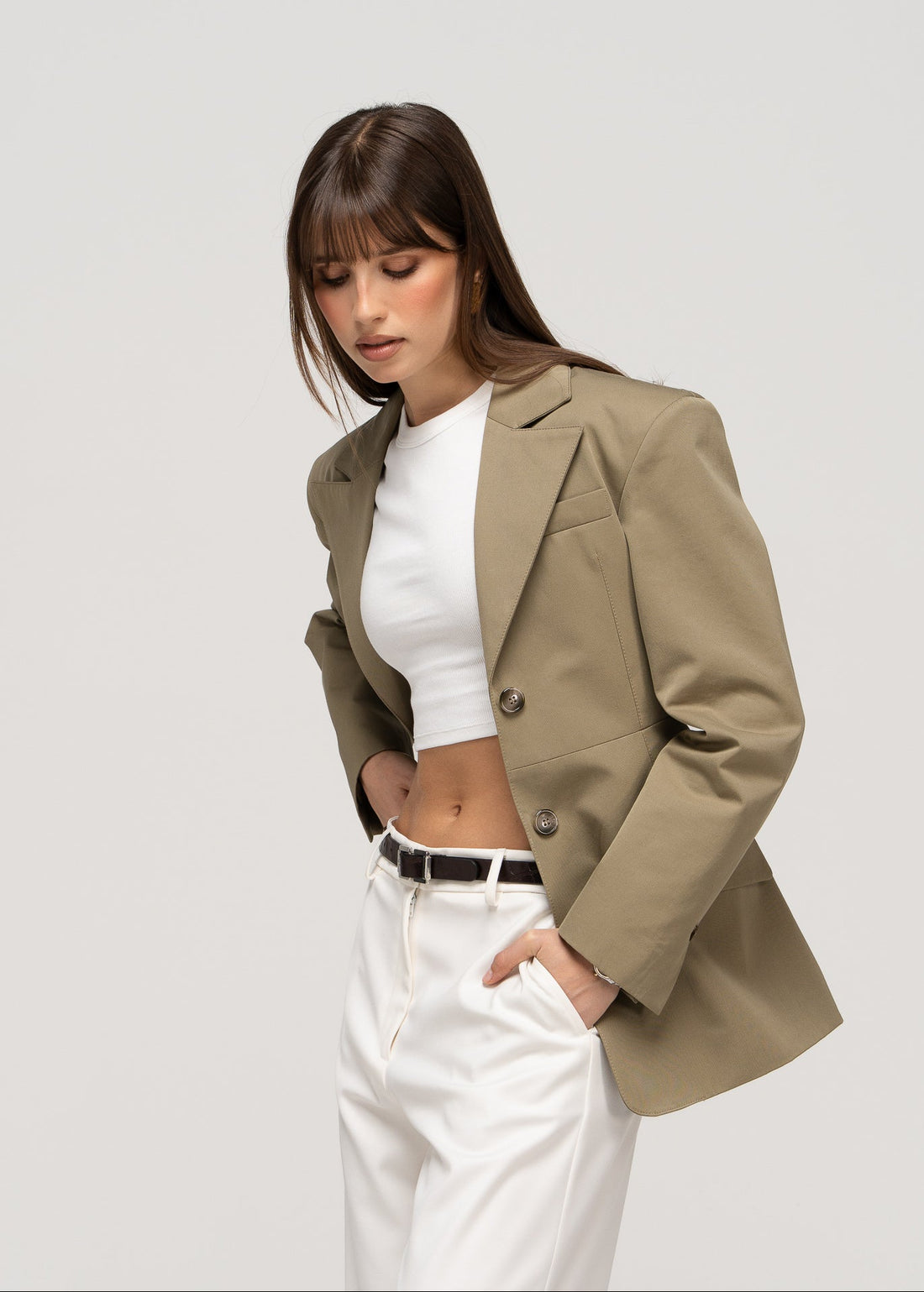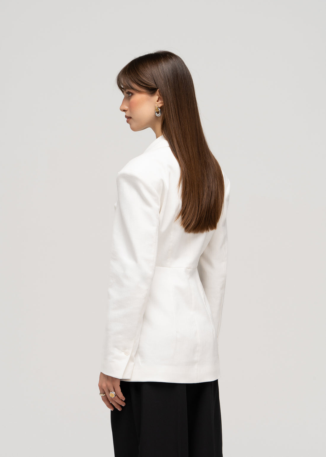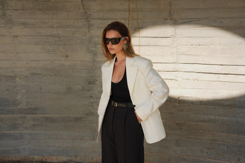 Tailored silhouette with a cinched waist and structured oversized shoulders 100% premium organic cotton Single-breasted...