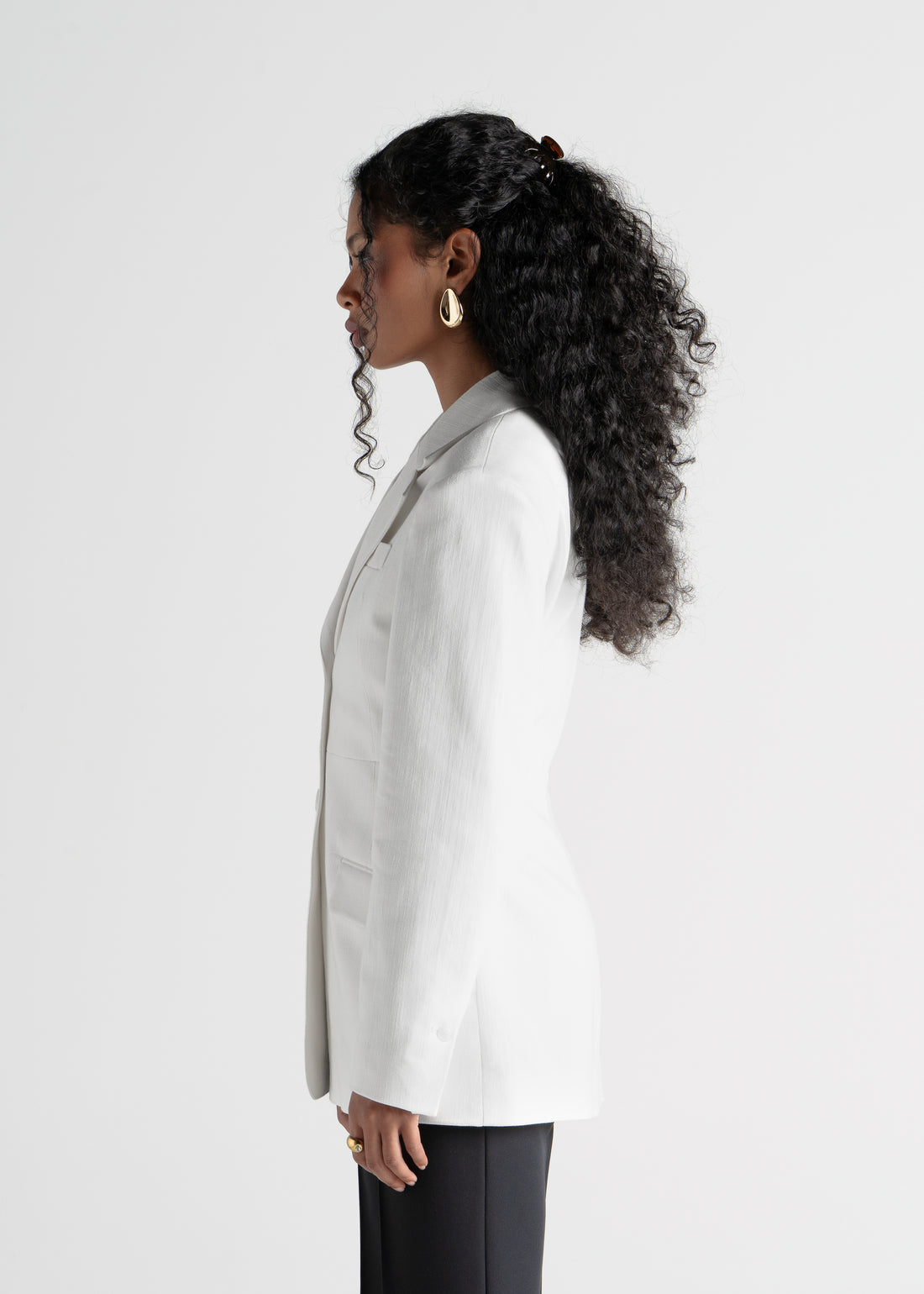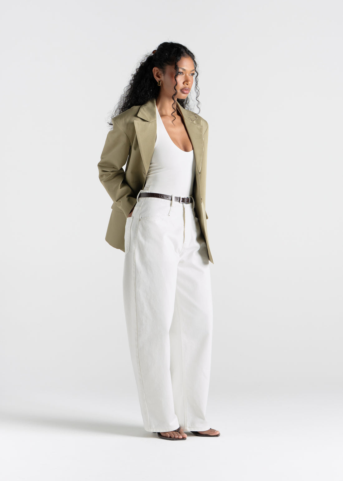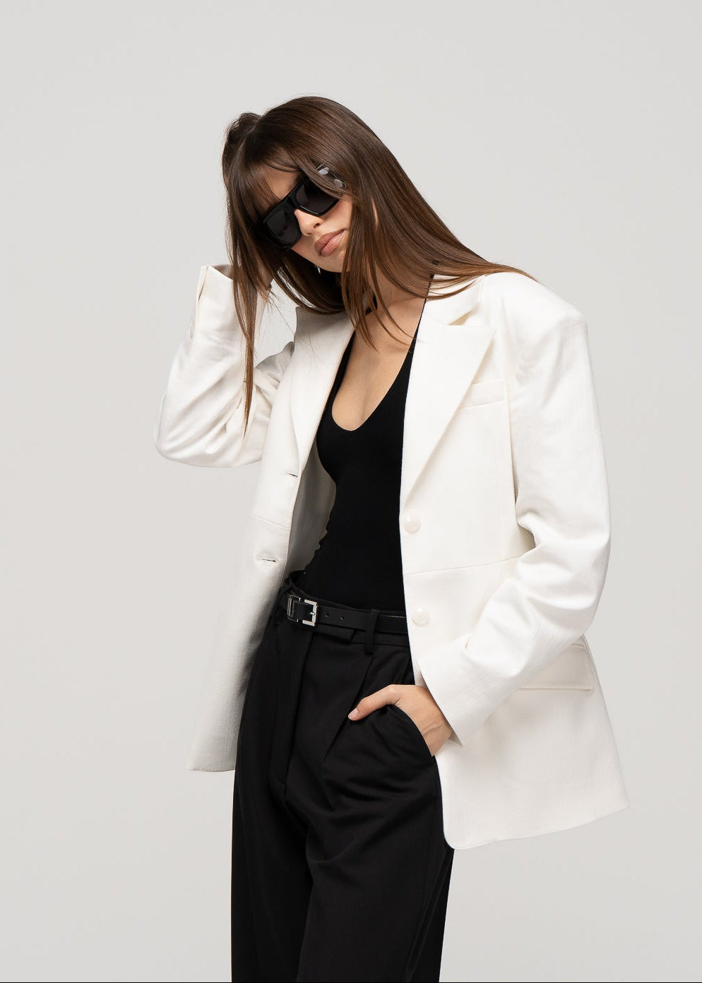 Tailored silhouette with a cinched waist and structured oversized shoulders 100% premium organic cotton Single-breasted...