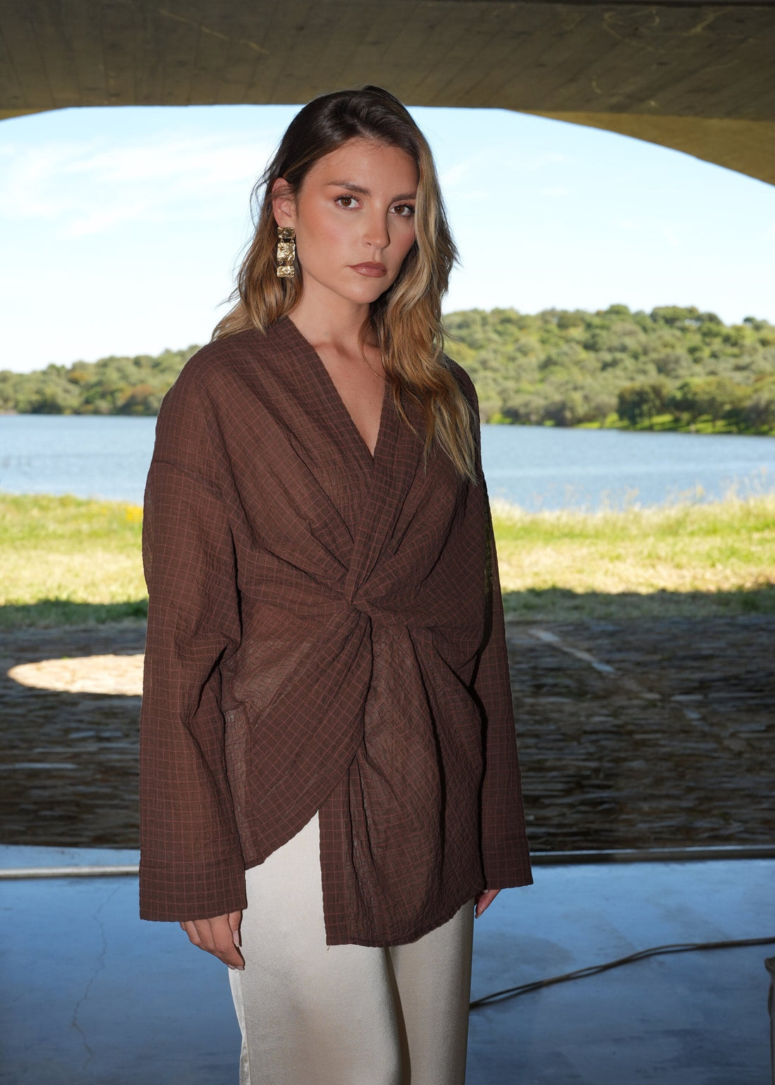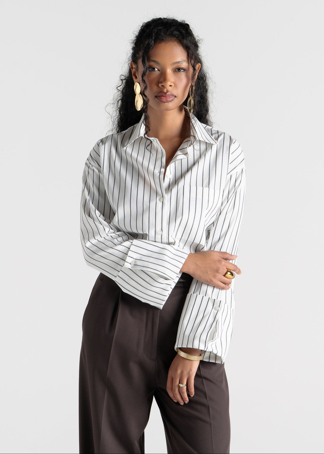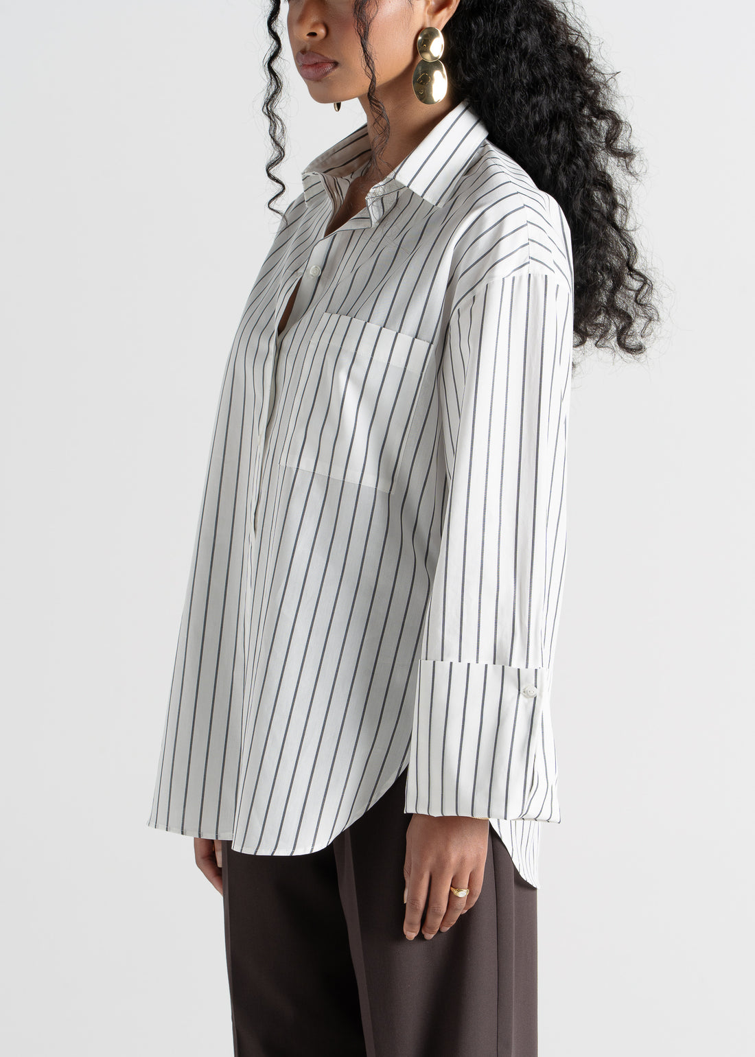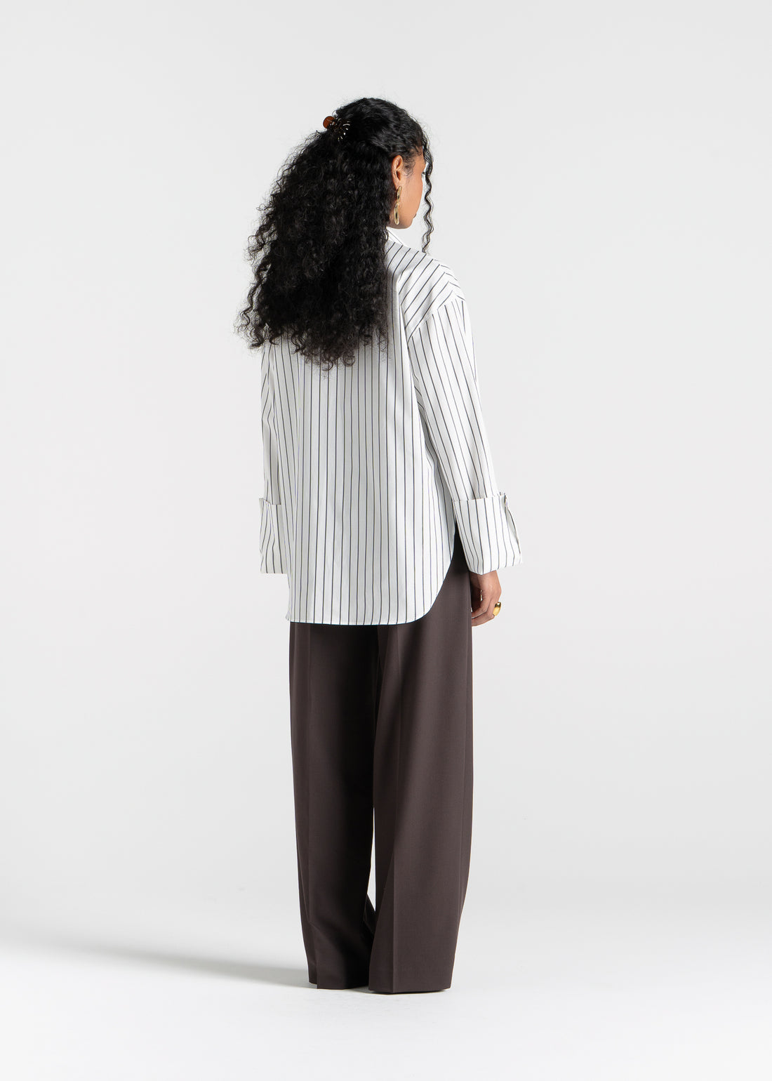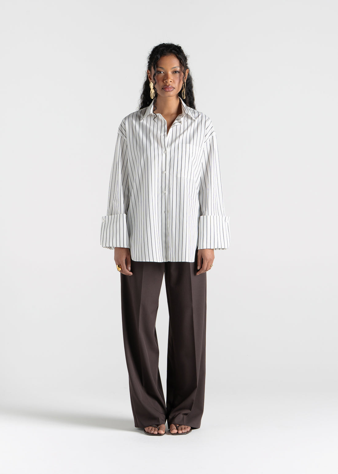 Gia Wide Cuff Cotton Shirt - White & Brown