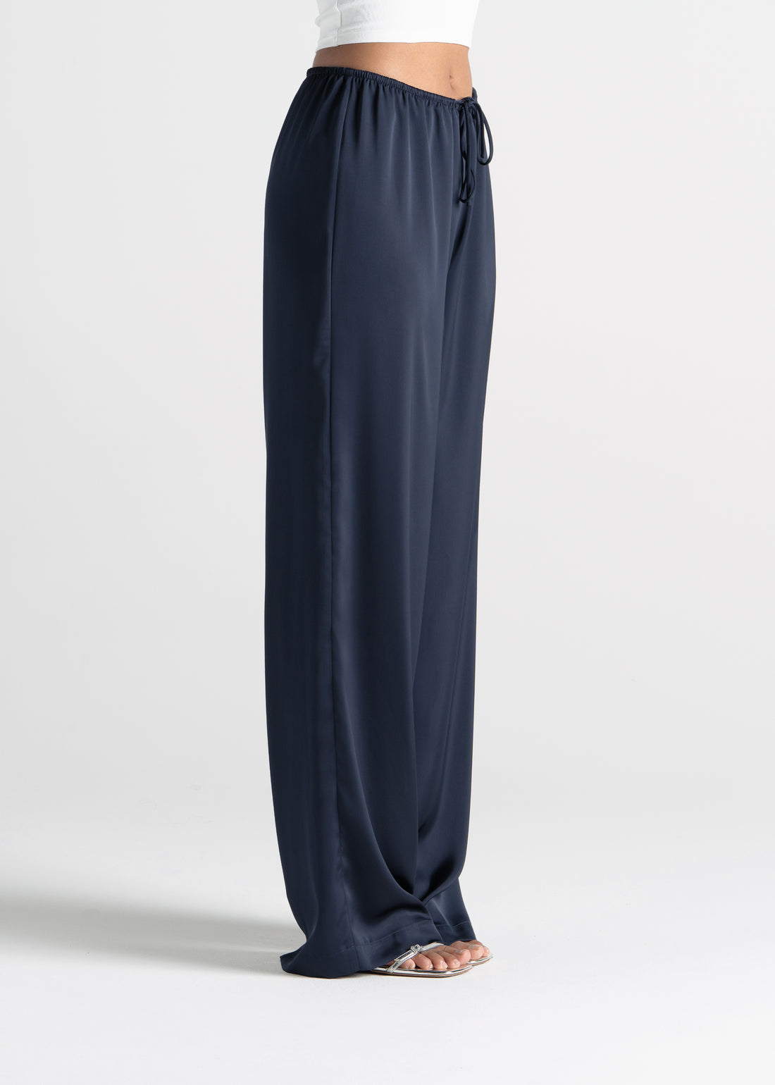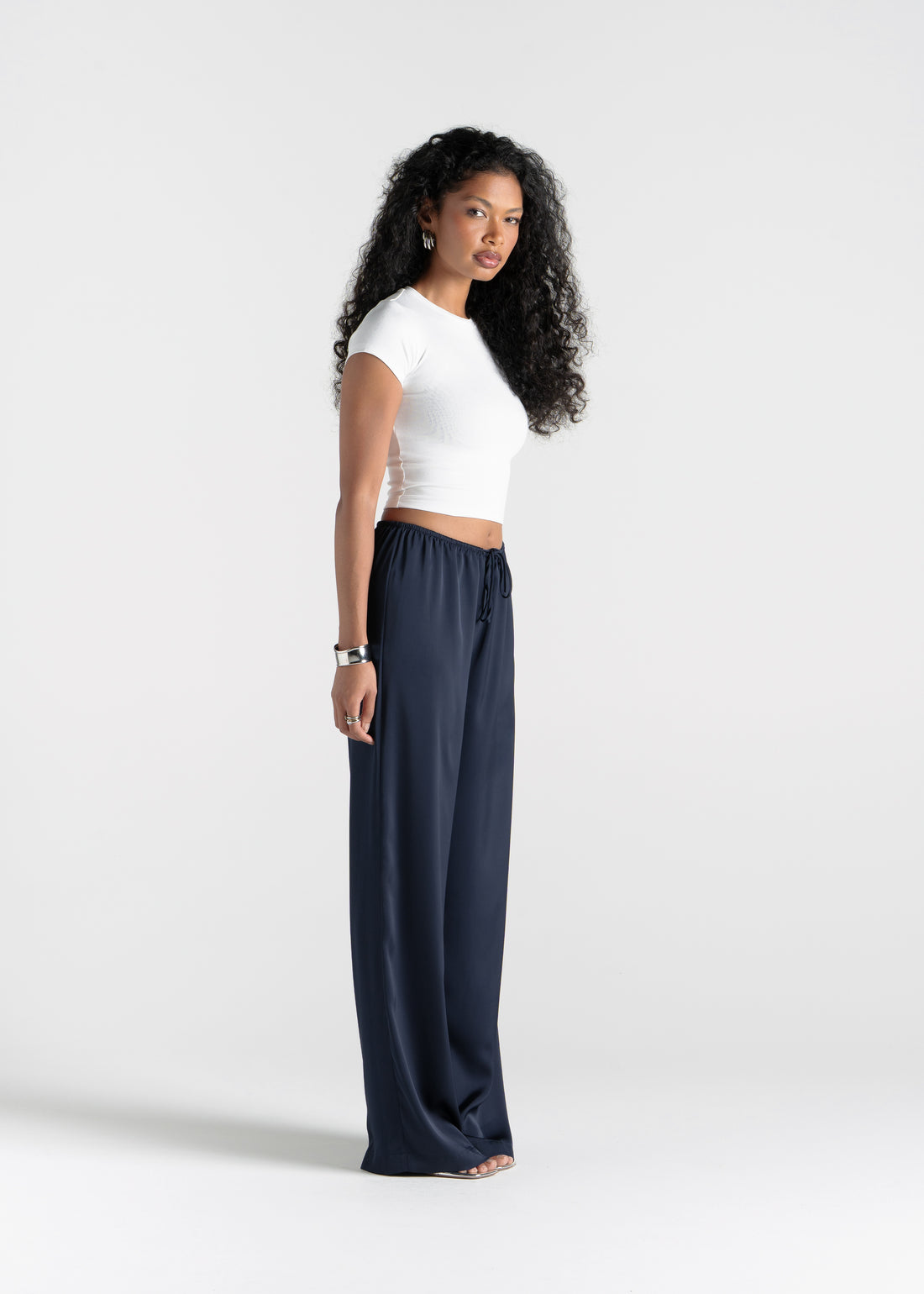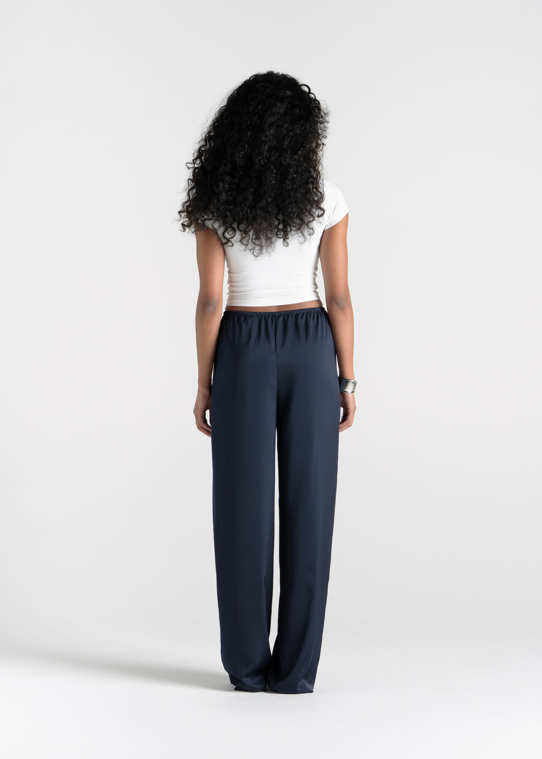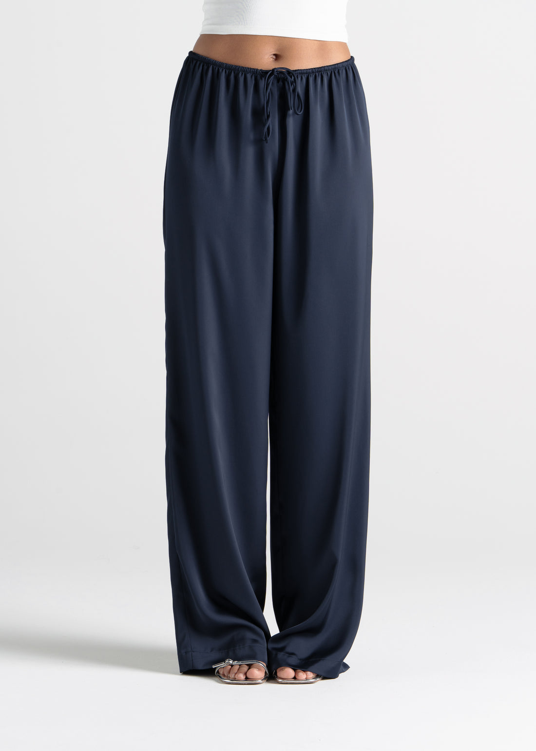 Adjustable drawstring Relaxed full-length leg Fluid satin trousers with a soft sheen and adjustable drawstring...