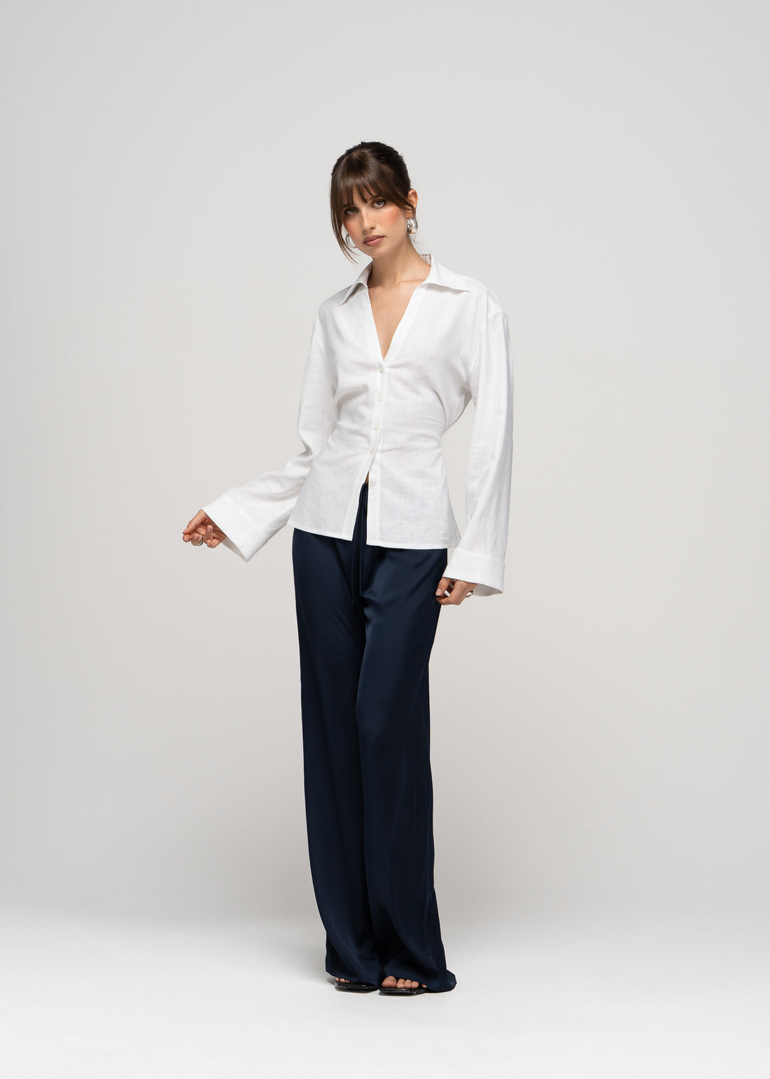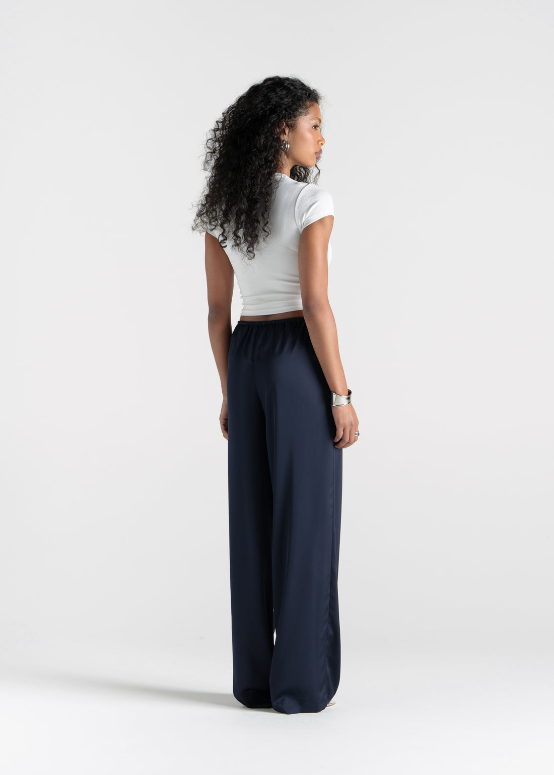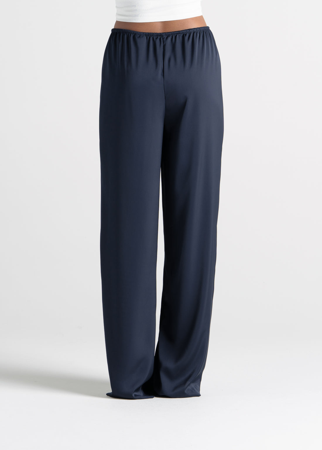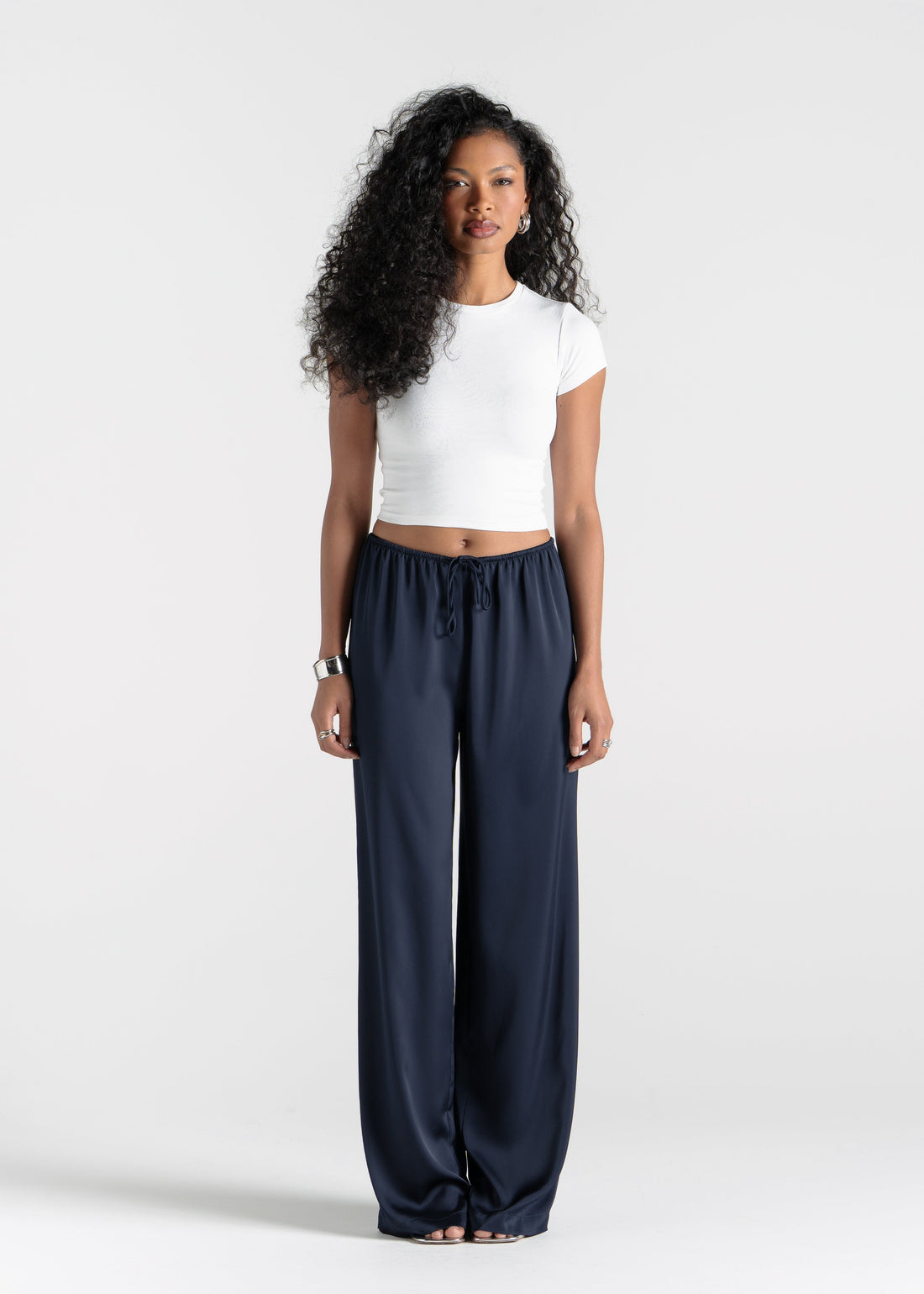 Adjustable drawstring Relaxed full-length leg Fluid satin trousers with a soft sheen and adjustable drawstring...