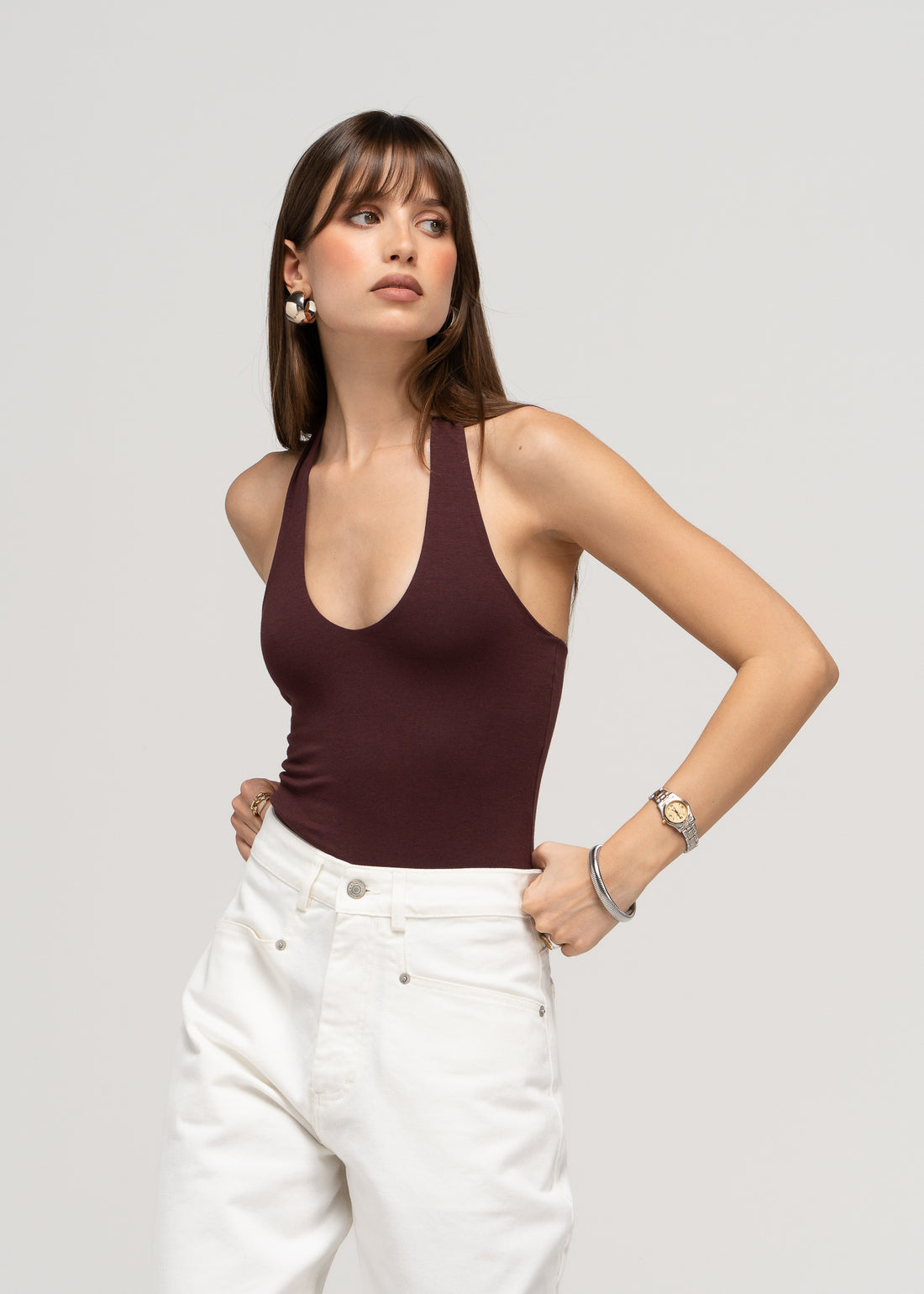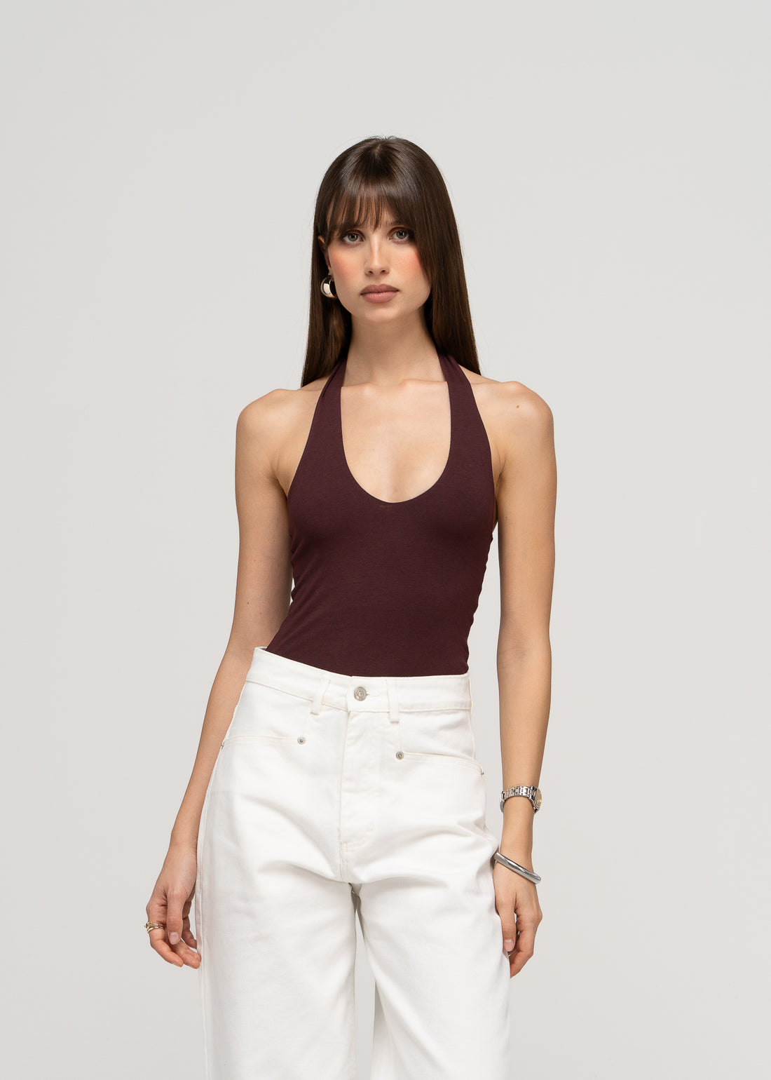 Double-layered for support and non-sheer coverage Deep plunge neckline Halter design with open back Body-hugging...