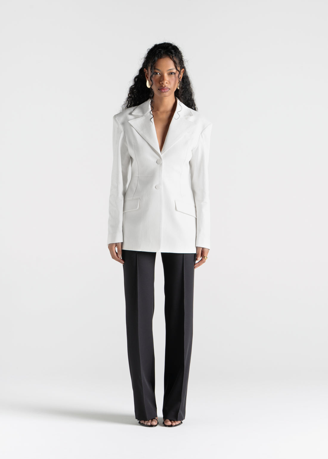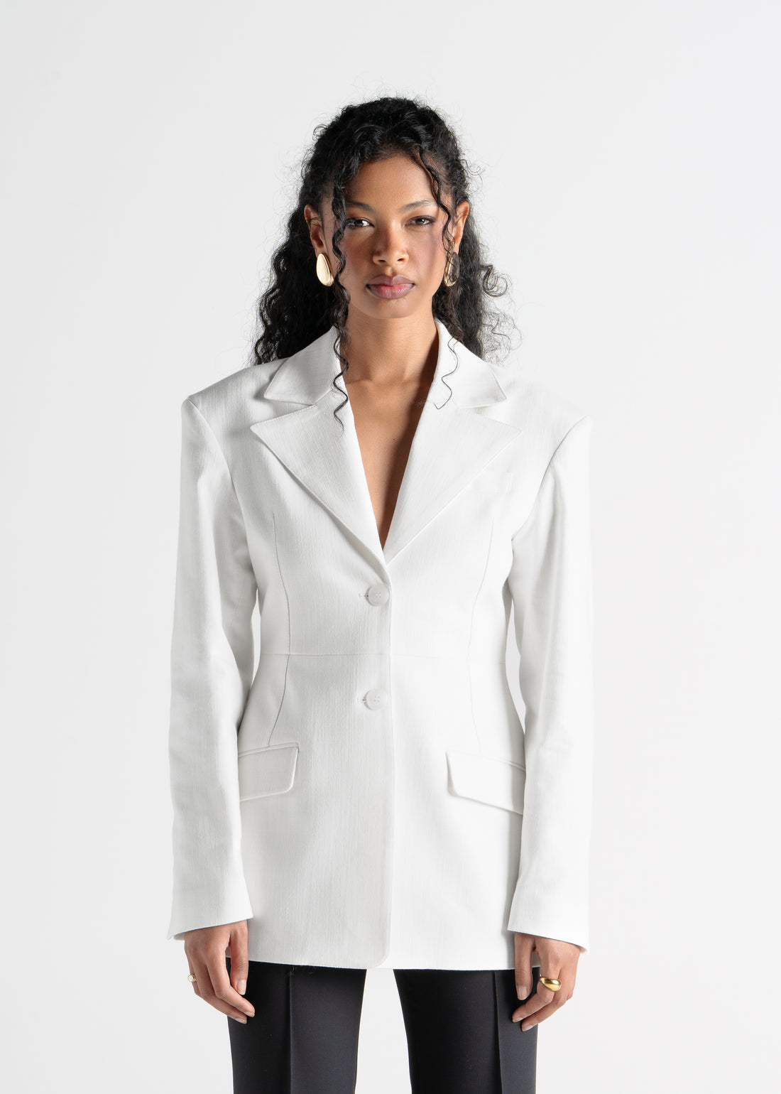 Tailored silhouette with a cinched waist and structured oversized shoulders 100% premium cotton blend Single-breasted...