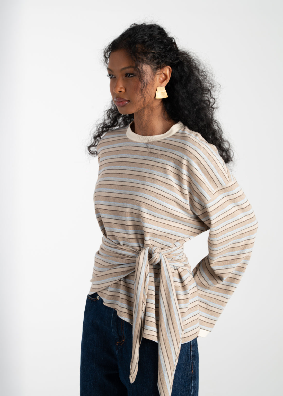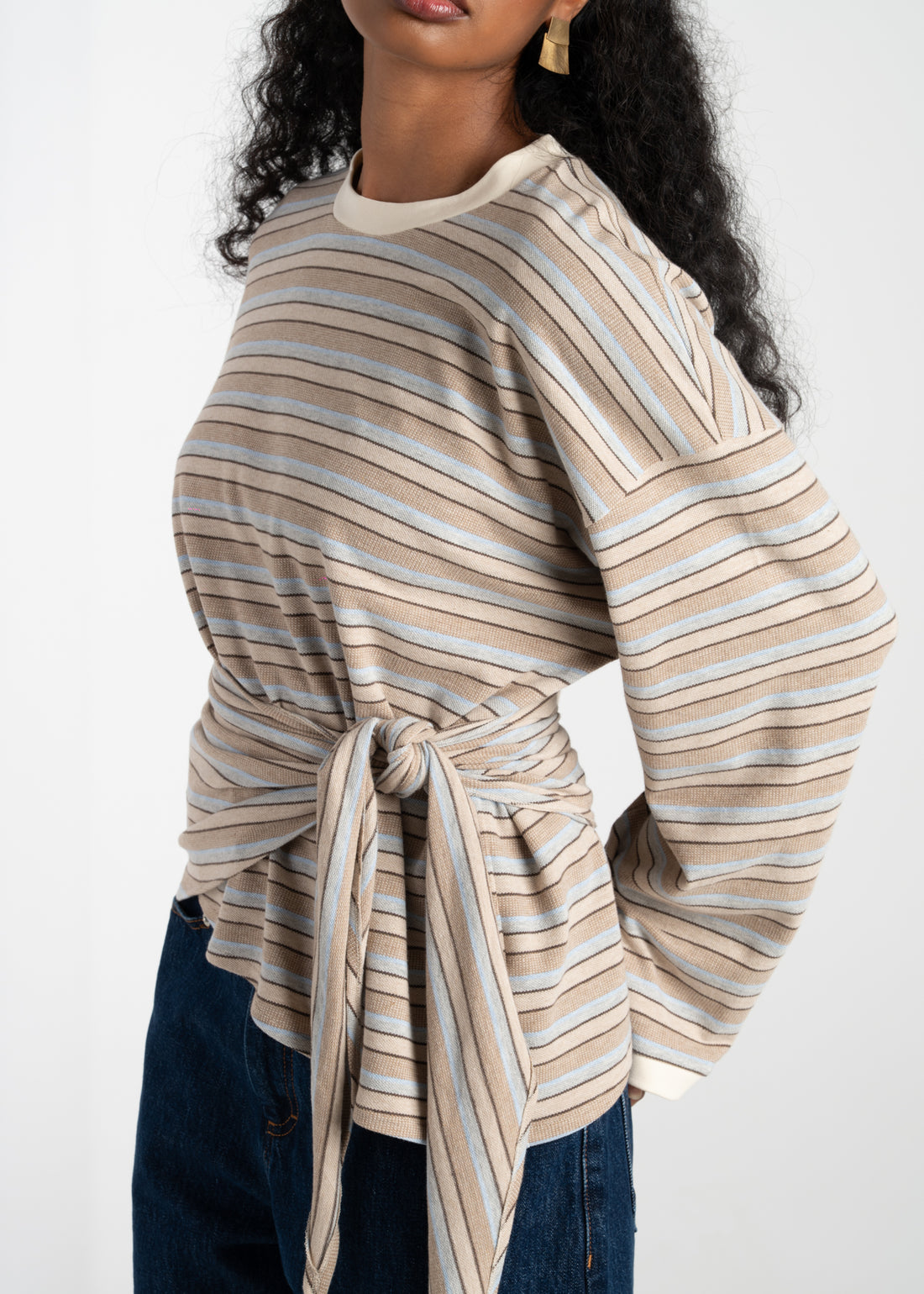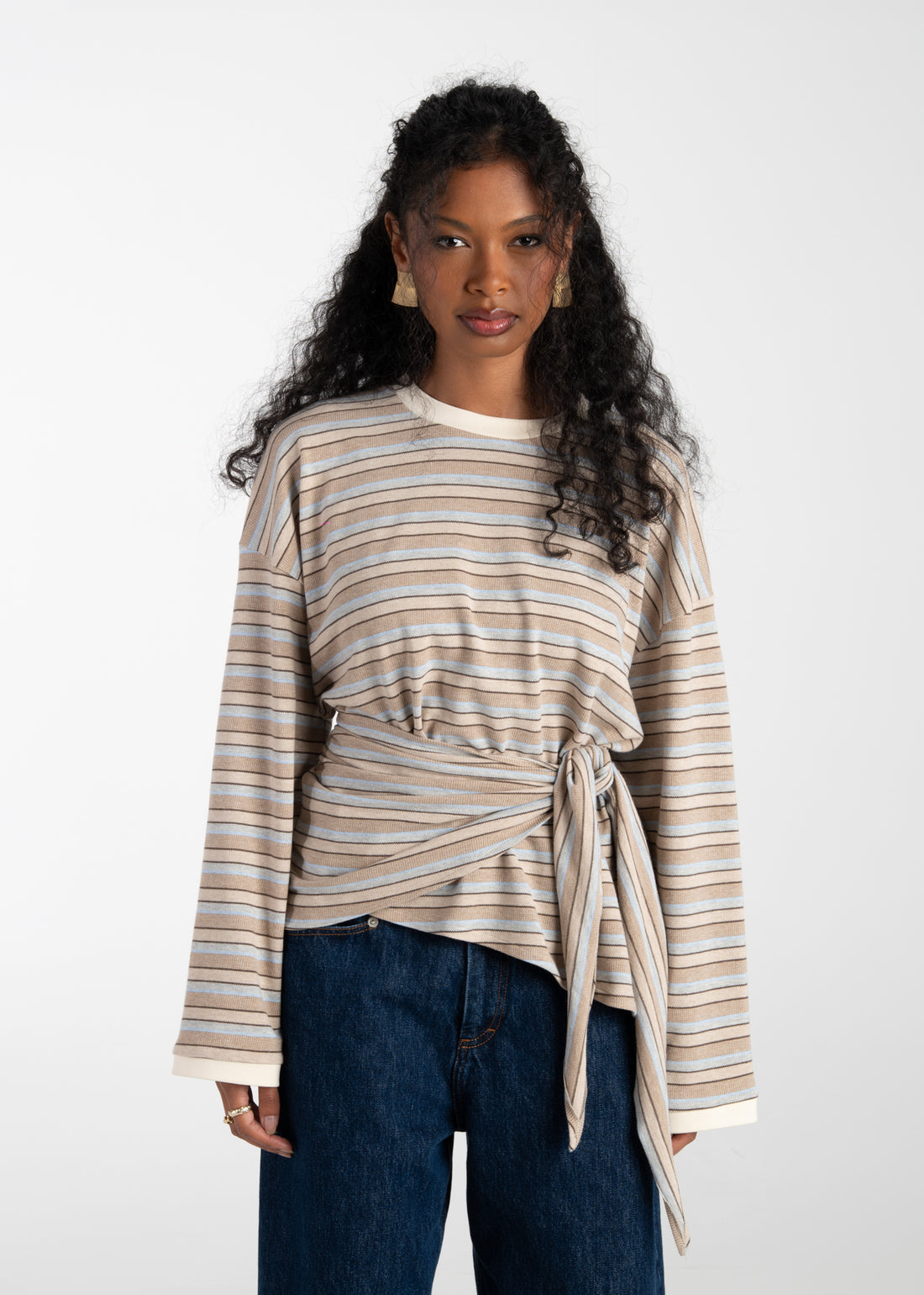 Self-tie wrap detail at the waist Asymmetric hem Relaxed fit A striped long-sleeve top with...